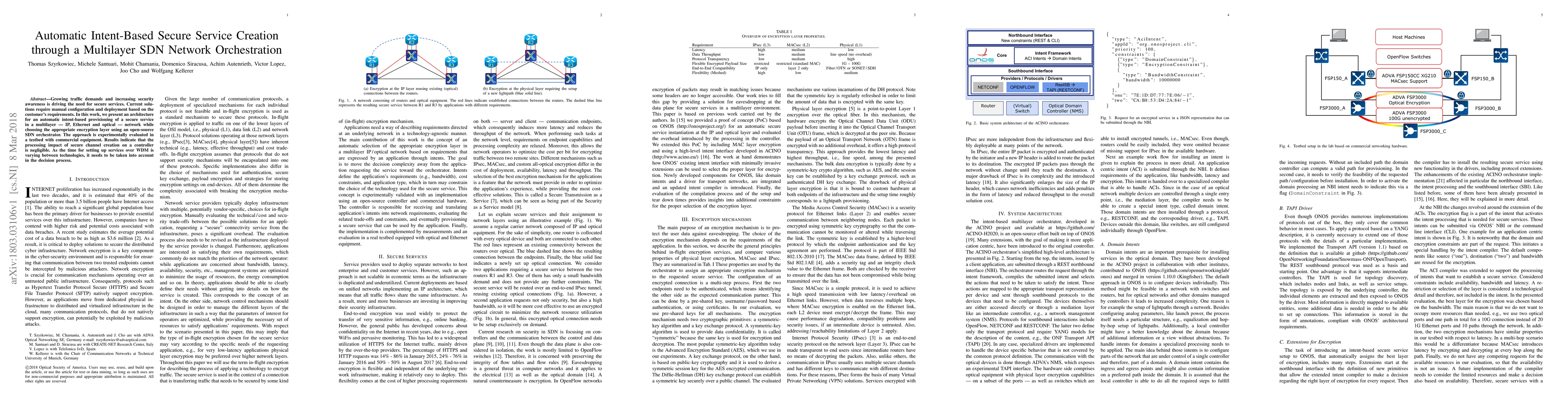 Growing traffic demands and increasing security awareness are driving the need for secure services. Current solutions require manual configuration and deployment based on the customer's requirements. In this work, we present an architecture for an automatic intent-based provisioning of a secure service in a multilayer - IP, Ethernet, and optical - network while choosing the appropriate encryption layer using an open-source software-defined networking (SDN) orchestrator. The approach is experimentally evaluated in a testbed with commercial equipment. Results indicate that the processing impact of secure channel creation on a controller is negligible. As the time for setting up services over WDM varies between technologies, it needs to be taken into account in the decision-making process.