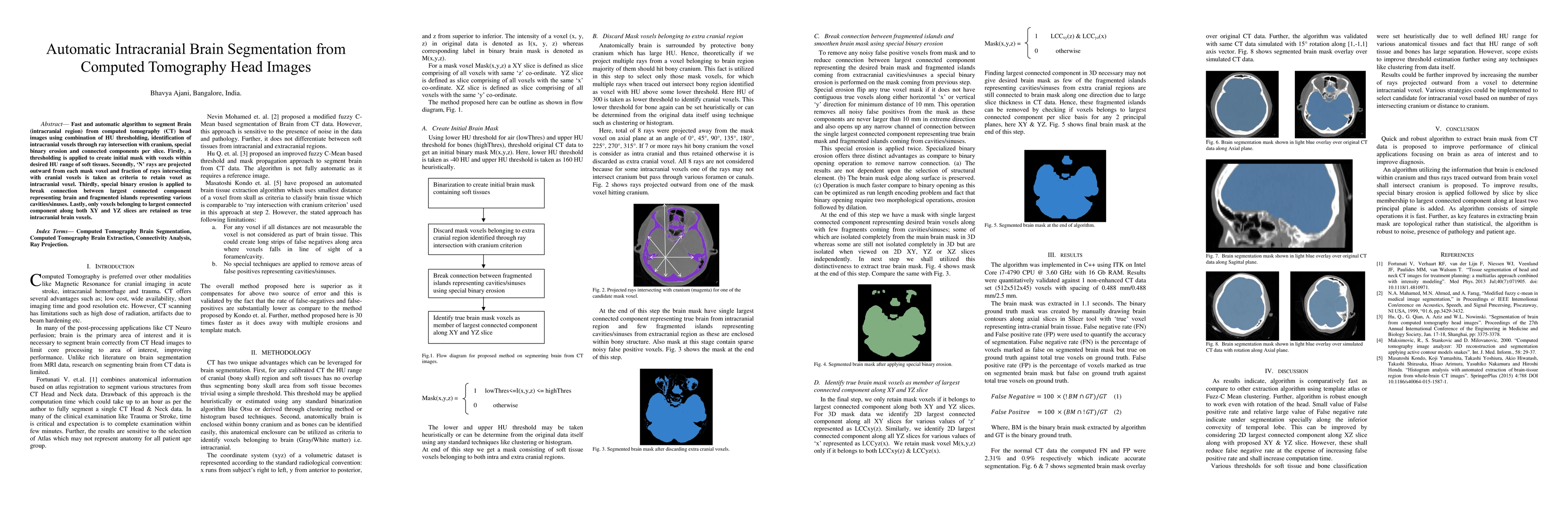 Summary: This paper presents a fast and automatic algorithm for segmenting the intracranial brain region from CT head images, utilizing HU thresholding, ray intersection with the cranium, binary erosion, and connected component analysis per slice for precise delineation.