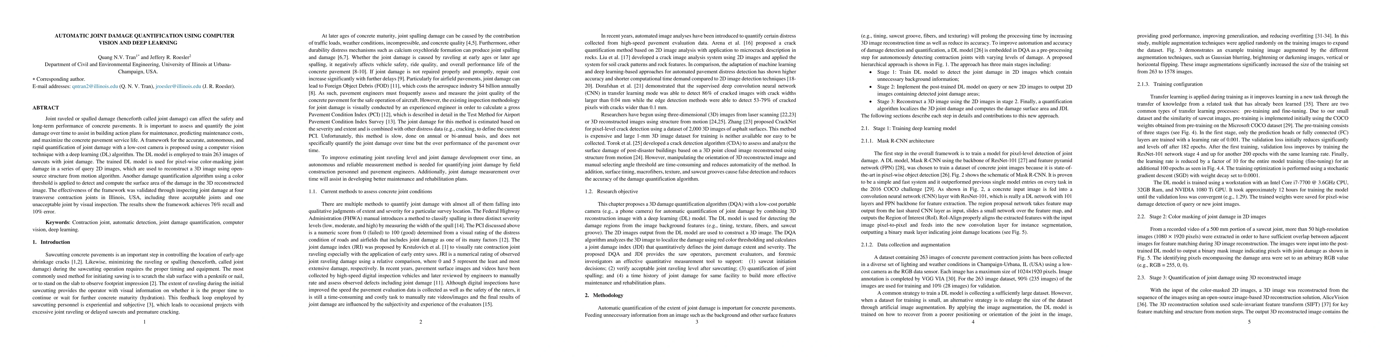 This paper proposes a computer vision framework using deep learning to automatically quantify joint damage in concrete pavements. The framework employs a trained deep learning model to detect and measure joint damage from 2D images, which are then reconstructed into 3D for further analysis, achieving 76% recall and 10% error in validation tests.