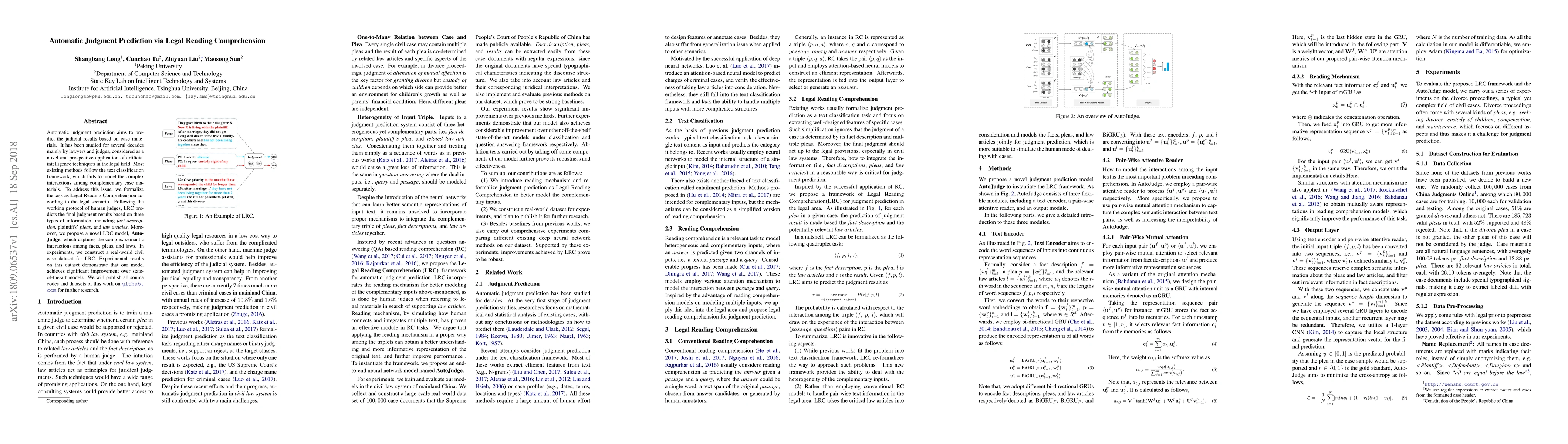 This paper proposes a novel Legal Reading Comprehension (LRC) model, AutoJudge, to predict judicial outcomes by modeling interactions among case facts, plaintiffs' pleas, and relevant law articles. The model outperforms existing text classification methods and will release its dataset and code for further research.