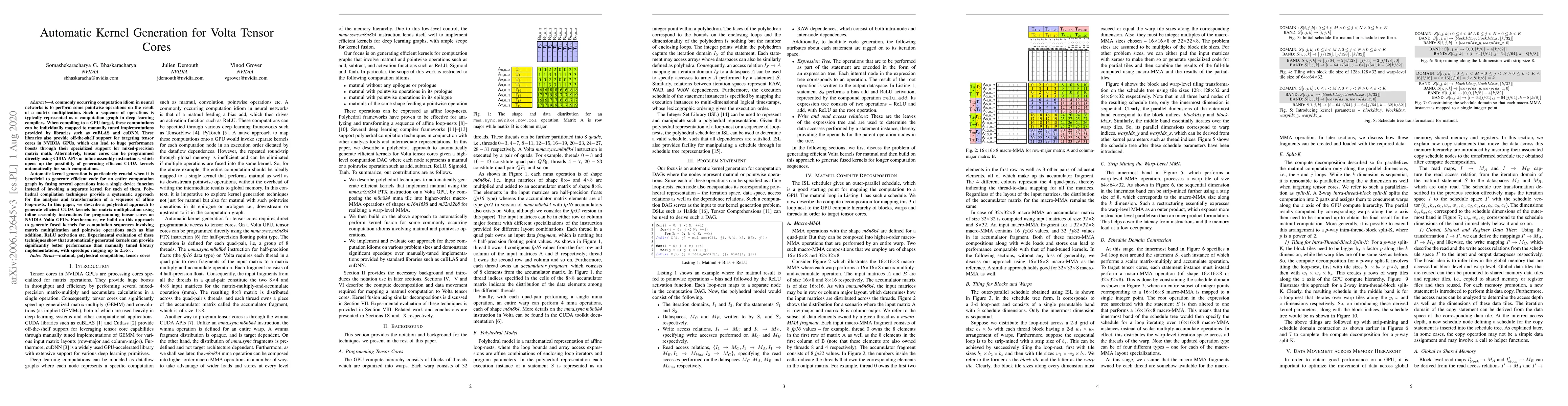 This paper presents a polyhedral approach to automatically generate efficient CUDA kernels for tensor core operations on NVIDIA Volta GPUs, achieving up to 2.55X performance improvements over manually tuned library implementations by fusing multiple operations into single kernels.
