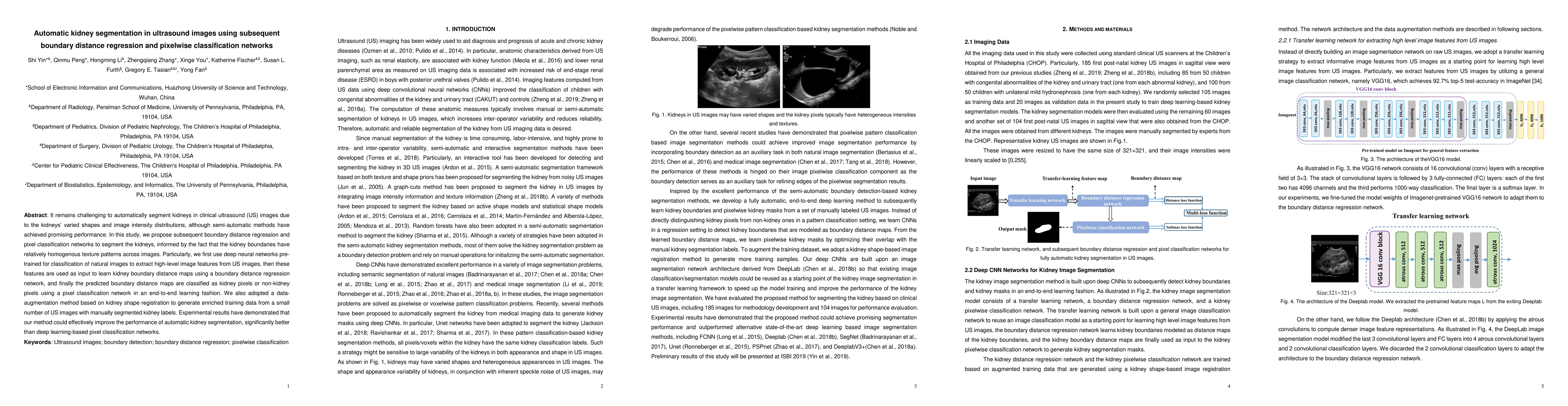 This paper proposes a method for automatic kidney segmentation in ultrasound images using a combination of boundary distance regression and pixel classification networks. The approach leverages pre-trained deep neural networks to extract features, followed by regression and classification networks to delineate kidney boundaries, achieving superior segmentation performance compared to traditional pixel classification networks.