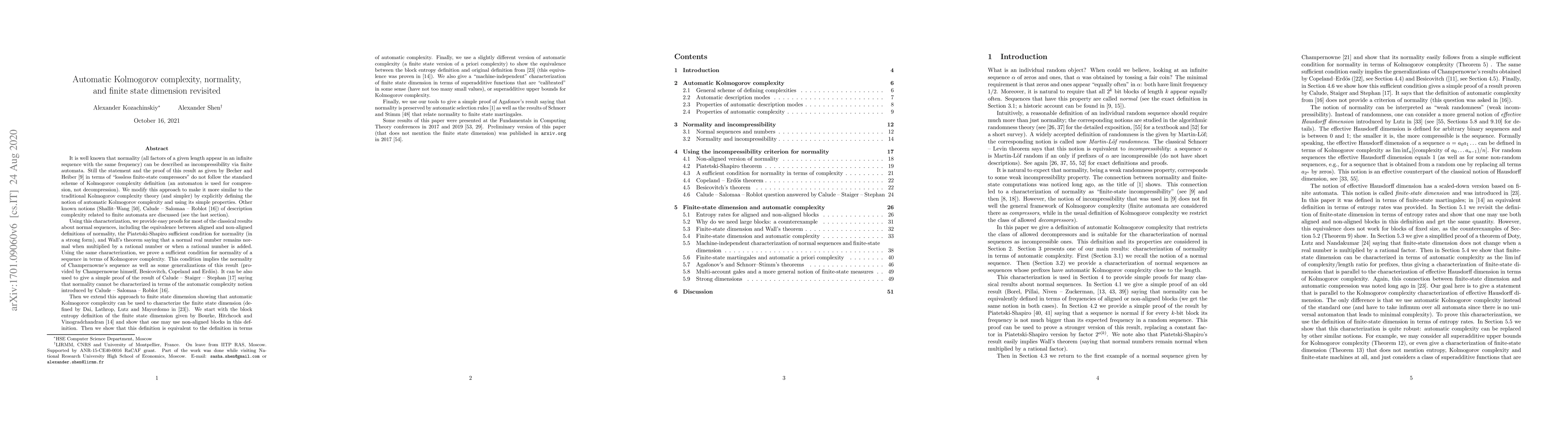 This paper redefines automatic Kolmogorov complexity to align with traditional theory, providing simpler proofs for classical results on normal sequences. It extends the approach to finite state dimension, offering equivalent definitions and proving known results about it, including Agafonov's preservation of normality by automatic selection rules.