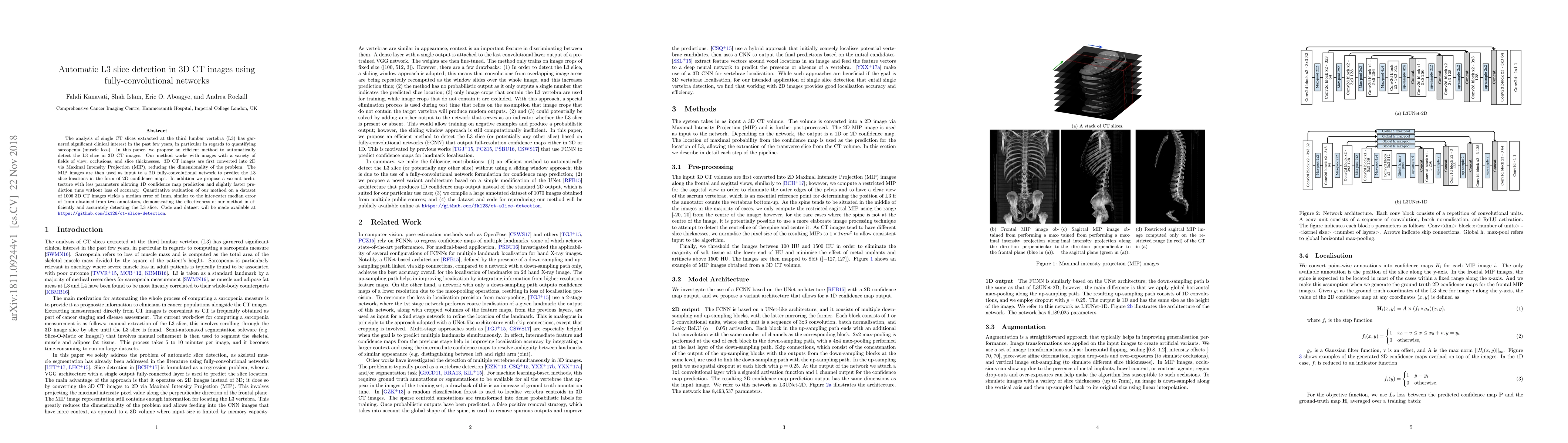 This paper proposes an automatic method using fully-convolutional networks to detect the L3 slice in 3D CT images, crucial for quantifying sarcopenia. The method employs Maximal Intensity Projection and 2D/1D fully-convolutional networks, achieving a median error of 1mm, comparable to manual annotations.