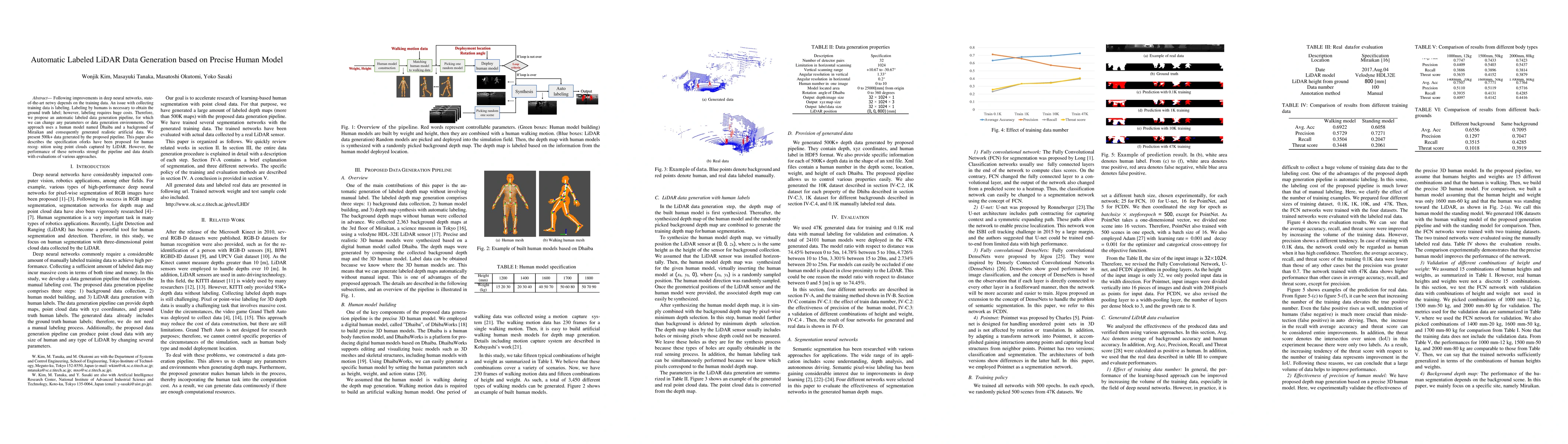 Following improvements in deep neural networks, state-of-the-art networks have been proposed for human recognition using point clouds captured by LiDAR. However, the performance of these networks strongly depends on the training data. An issue with collecting training data is labeling. Labeling by humans is necessary to obtain the ground truth label; however, labeling requires huge costs. Therefore, we propose an automatic labeled data generation pipeline, for which we can change any parameters or data generation environments. Our approach uses a human model named Dhaiba and a background of Miraikan and consequently generated realistic artificial data. We present 500k+ data generated by the proposed pipeline. This paper also describes the specification of the pipeline and data details with evaluations of various approaches.