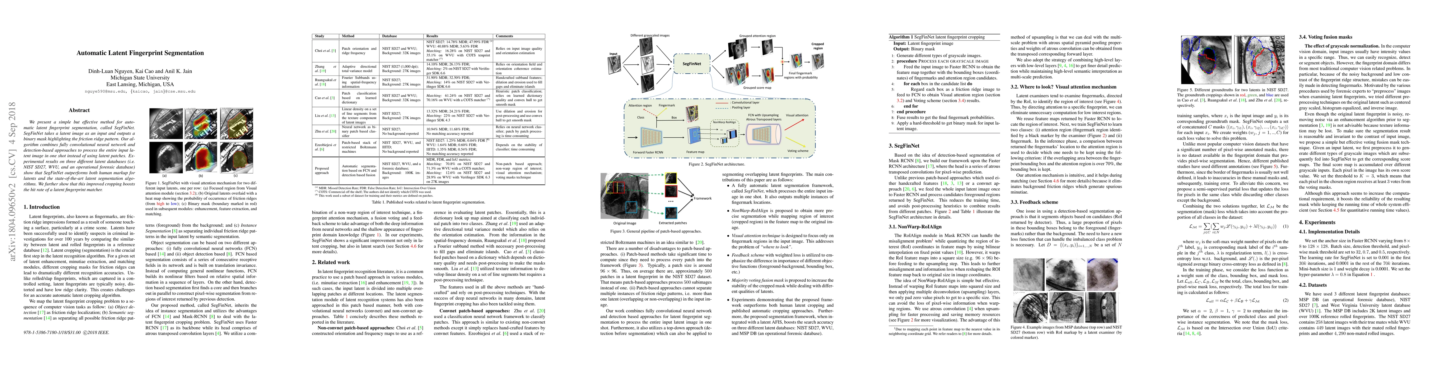 SegFinNet is an automatic method for latent fingerprint segmentation that combines convolutional neural networks and detection-based approaches, outperforming human markup and existing algorithms, and enhancing latent fingerprint matcher hit rates.