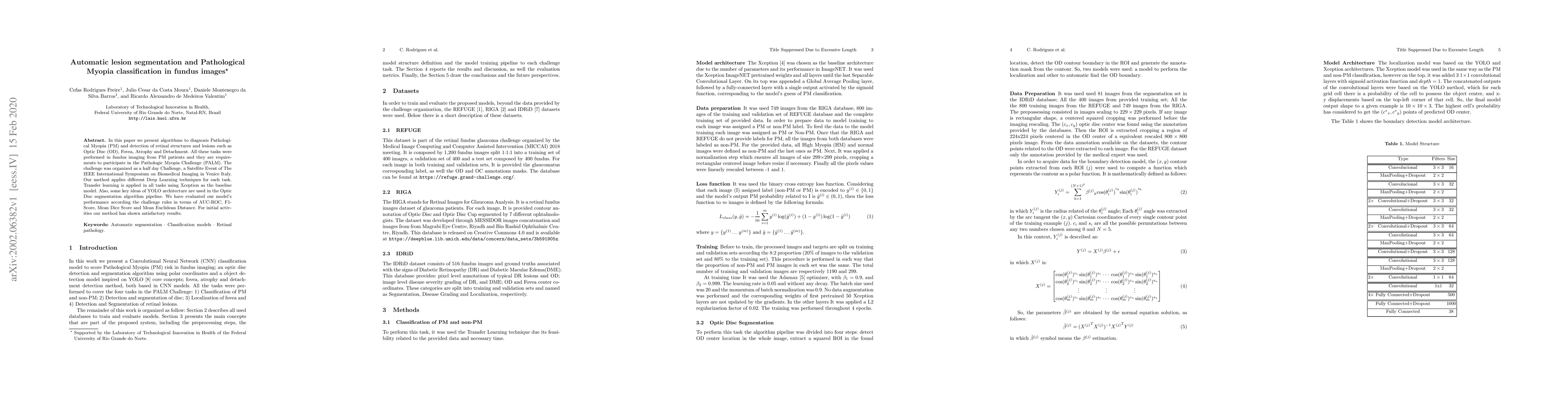 In this paper we present algorithms to diagnosis Pathological Myopia (PM) and detection of retinal structures and lesions such asOptic Disc (OD), Fovea, Atrophy and Detachment. All these tasks were performed in fundus imaging from PM patients and they are requirements to participate in the Pathologic Myopia Challenge (PALM). The challenge was organized as a half day Challenge, a Satellite Event of The IEEE International Symposium on Biomedical Imaging in Venice Italy.Our method applies different Deep Learning techniques for each task. Transfer learning is applied in all tasks using Xception as the baseline model. Also, some key ideas of YOLO architecture are used in the Optic Disc segmentation algorithm pipeline. We have evaluated our model's performance according the challenge rules in terms of AUC-ROC, F1-Score, Mean Dice Score and Mean Euclidean Distance. For initial activities our method has shown satisfactory results.
