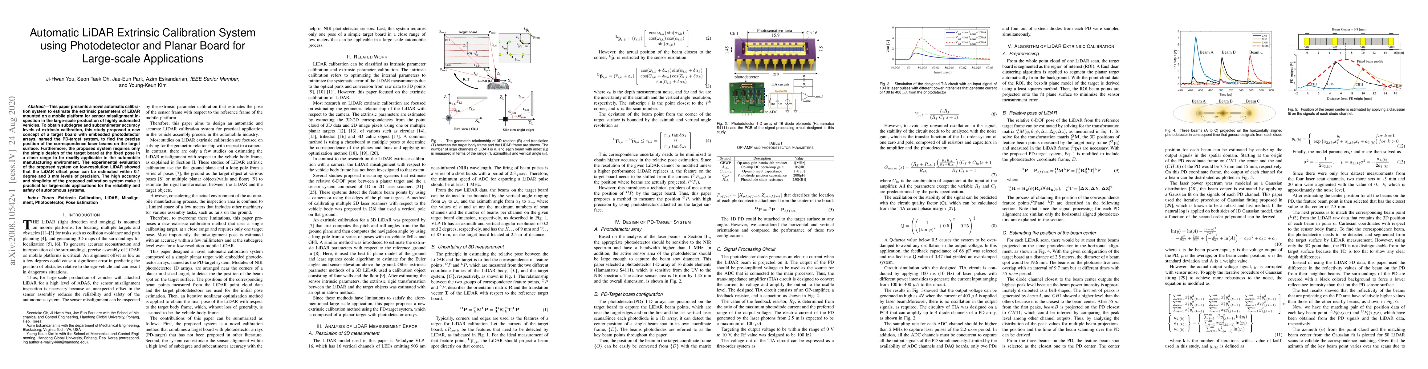 This paper presents a novel automatic calibration system to estimate the extrinsic parameters of LiDAR mounted on a mobile platform for sensor misalignment inspection in the large-scale production of highly automated vehicles. To obtain subdegree and subcentimeter accuracy levels of extrinsic calibration, this study proposed a new concept of a target board with embedded photodetector arrays, named the PD-target system, to find the precise position of the correspondence laser beams on the target surface. Furthermore, the proposed system requires only the simple design of the target board at the fixed pose in a close range to be readily applicable in the automobile manufacturing environment. The experimental evaluation of the proposed system on low-resolution LiDAR showed that the LiDAR offset pose can be estimated within 0.1 degree and 3 mm levels of precision. The high accuracy and simplicity of the proposed calibration system make it practical for large-scale applications for the reliability and safety of autonomous systems.