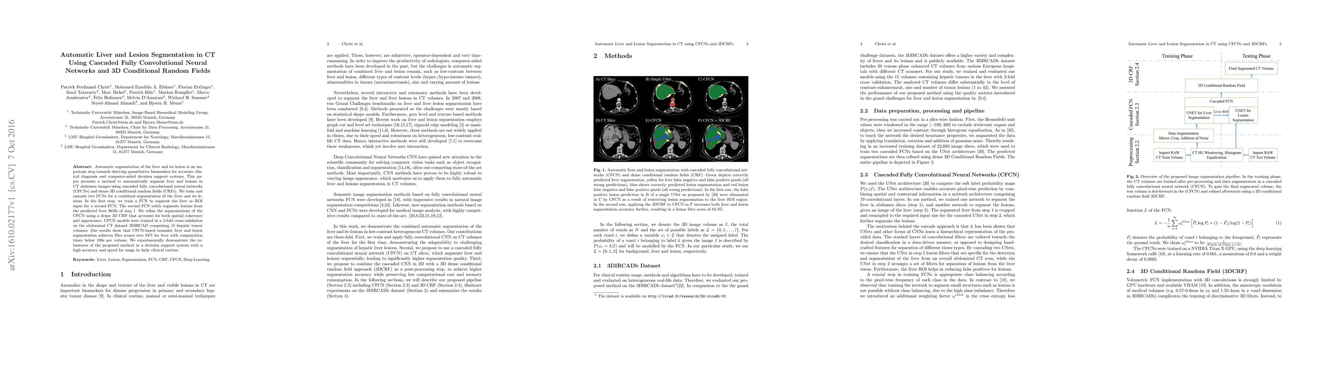 This paper proposes a method using cascaded fully convolutional neural networks (CFCNs) and 3D conditional random fields (CRFs) for automatic liver and lesion segmentation in CT abdomen images, achieving Dice scores over 94% for liver segmentation and demonstrating high accuracy and speed suitable for clinical use.