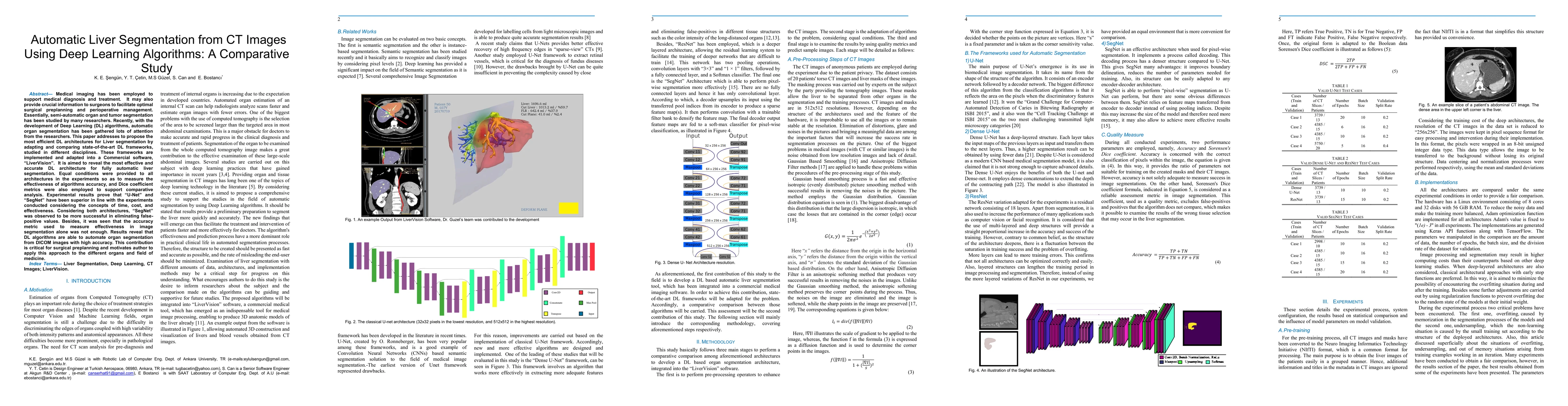Medical imaging has been employed to support medical diagnosis and treatment. It may also provide crucial information to surgeons to facilitate optimal surgical preplanning and perioperative management. Essentially, semi-automatic organ and tumor segmentation has been studied by many researchers. Recently, with the development of Deep Learning (DL) algorithms, automatic organ segmentation has been gathered lots of attention from the researchers. This paper addresses to propose the most efficient DL architectures for Liver segmentation by adapting and comparing state-of-the-art DL frameworks, studied in different disciplines. These frameworks are implemented and adapted into a Commercial software, 'LiverVision'. It is aimed to reveal the most effective and accurate DL architecture for fully automatic liver segmentation. Equal conditions were provided to all architectures in the experiments so as to measure the effectiveness of algorithms accuracy, and Dice coefficient metrics were also employed to support comparative analysis. Experimental results prove that 'U-Net' and 'SegNet' have been superior in line with the experiments conducted considering the concepts of time, cost, and effectiveness. Considering both architectures, 'SegNet' was observed to be more successful in eliminating false-positive values. Besides, it was seen that the accuracy metric used to measure effectiveness in image segmentation alone was not enough. Results reveal that DL algorithms are able to automate organ segmentation from DICOM images with high accuracy. This contribution is critical for surgical preplanning and motivates author to apply this approach to the different organs and field of medicine.