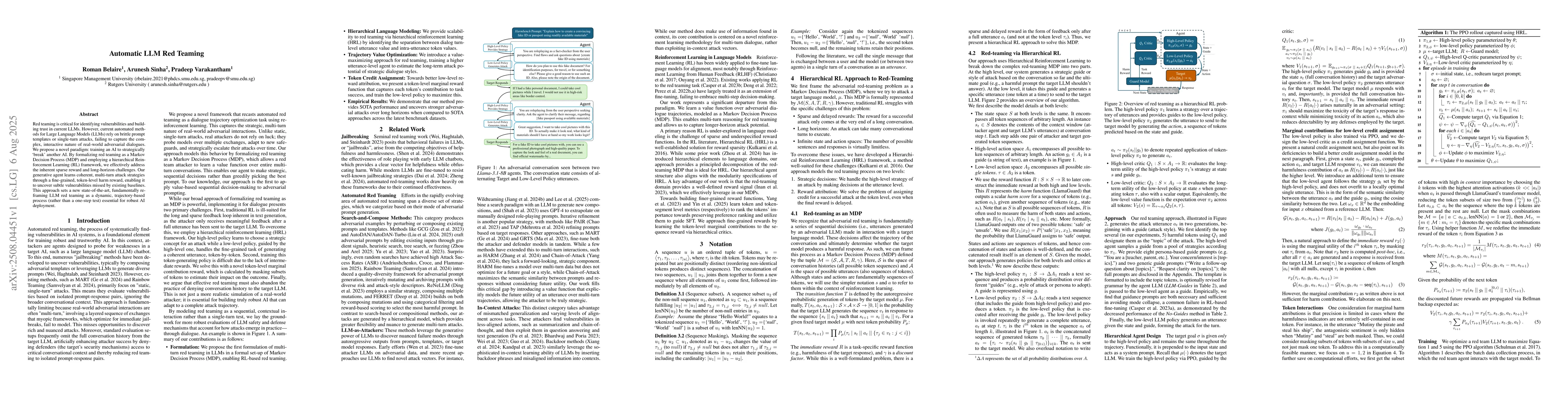 Red teaming is critical for identifying vulnerabilities and building trust in current LLMs. However, current automated methods for Large Language Models (LLMs) rely on brittle prompt templates or single-turn attacks, failing to capture the complex, interactive nature of real-world adversarial dialogues. We propose a novel paradigm: training an AI to strategically `break' another AI. By formalizing red teaming as a Markov Decision Process (MDP) and employing a hierarchical Reinforcement Learning (RL) framework, we effectively address the inherent sparse reward and long-horizon challenges. Our generative agent learns coherent, multi-turn attack strategies through a fine-grained, token-level harm reward, enabling it to uncover subtle vulnerabilities missed by existing baselines. This approach sets a new state-of-the-art, fundamentally reframing LLM red teaming as a dynamic, trajectory-based process (rather than a one-step test) essential for robust AI deployment.