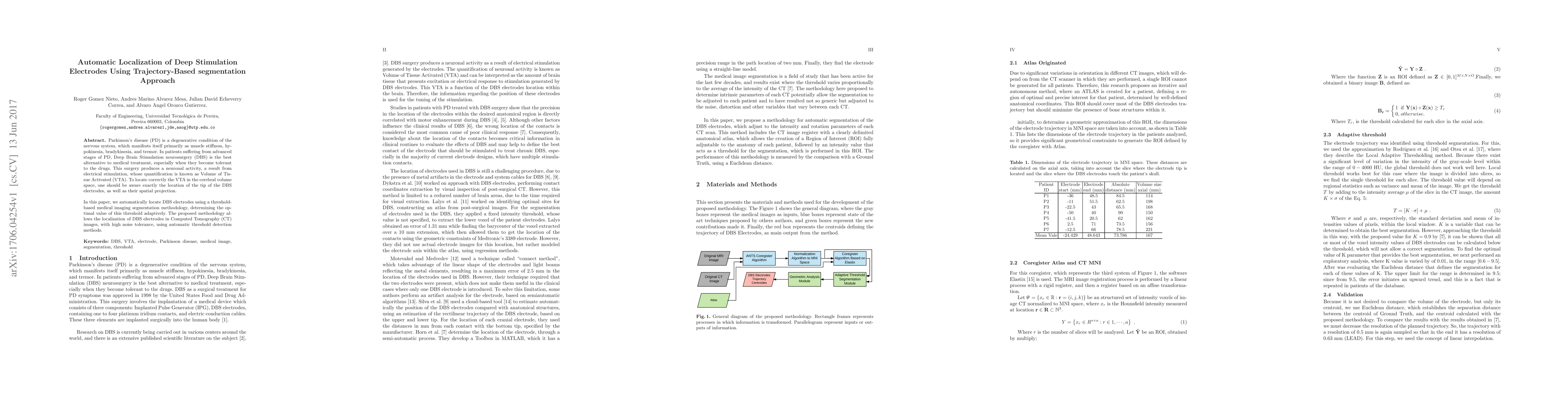 Parkinson's disease (PD) is a degenerative condition of the nervous system, which manifests itself primarily as muscle stiffness, hypokinesia, bradykinesia, and tremor. In patients suffering from advanced stages of PD, Deep Brain Stimulation neurosurgery (DBS) is the best alternative to medical treatment, especially when they become tolerant to the drugs. This surgery produces a neuronal activity, a result from electrical stimulation, whose quantification is known as Volume of Tissue Activated (VTA). To locate correctly the VTA in the cerebral volume space, one should be aware exactly the location of the tip of the DBS electrodes, as well as their spatial projection. In this paper, we automatically locate DBS electrodes using a threshold-based medical imaging segmentation methodology, determining the optimal value of this threshold adaptively. The proposed methodology allows the localization of DBS electrodes in Computed Tomography (CT) images, with high noise tolerance, using automatic threshold detection methods.