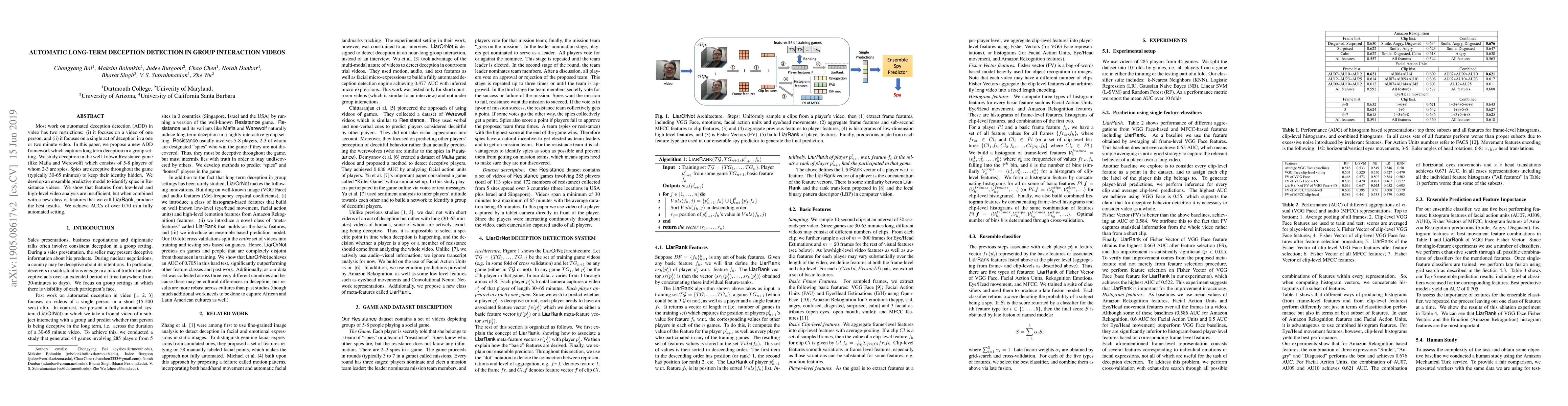 This paper introduces a novel framework for detecting long-term deception in group interactions through video analysis, focusing on the Resistance game. It combines low-level and high-level video features with a new LiarRank feature set to achieve over 70% AUC in identifying deceptive players.