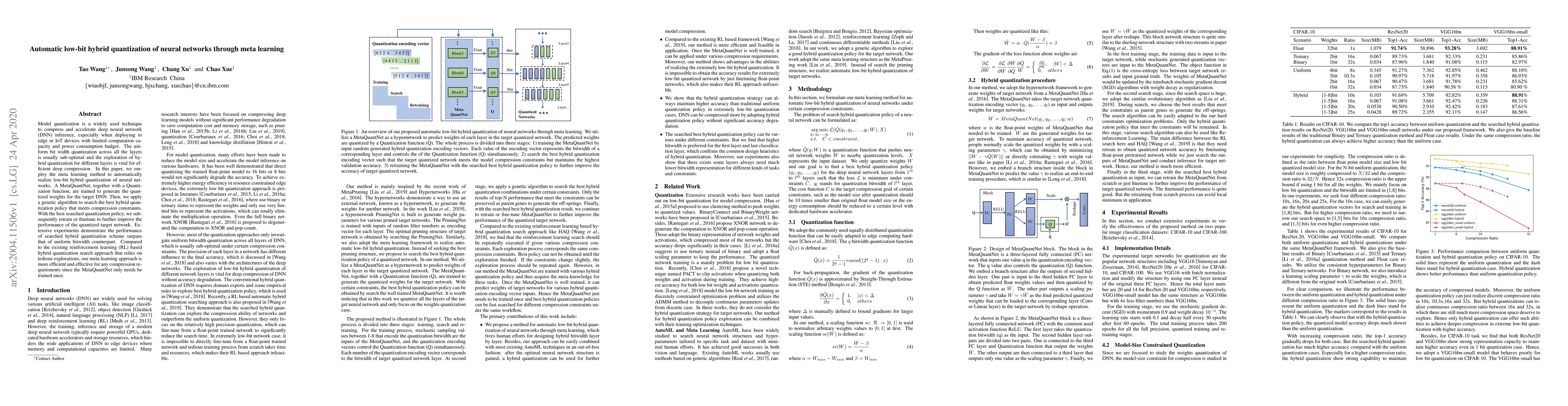 This paper proposes a meta learning approach for automatic low-bit hybrid quantization of neural networks, employing MetaQuantNet and a genetic algorithm to efficiently discover optimal quantization policies that outperform uniform bitwidth quantization, requiring less exploration compared to reinforcement learning methods.