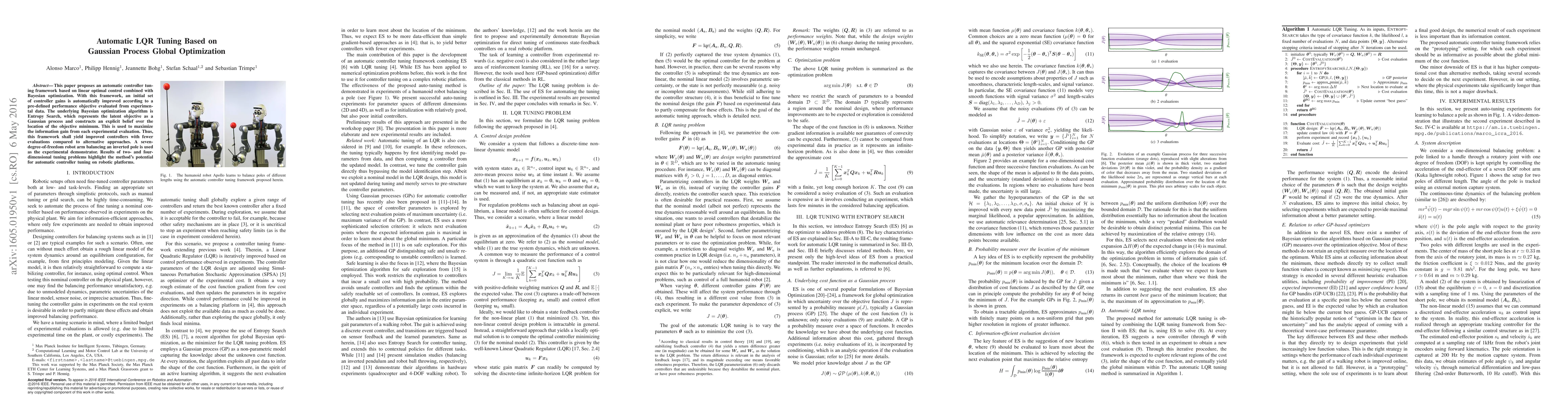 This paper presents an automatic tuning framework for LQR controllers using Gaussian process global optimization and Bayesian optimization, specifically Entropy Search, to improve controller gains based on experimental data. The method demonstrates effective tuning with fewer evaluations, as shown through experiments on a seven-degree-of-freedom robot arm balancing an inverted pole.