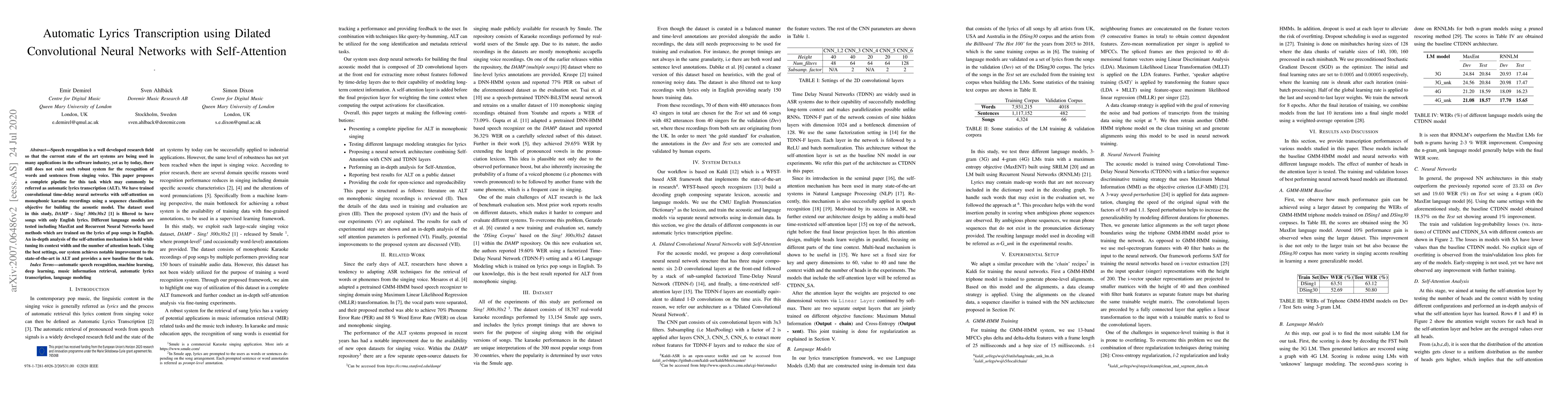 Speech recognition is a well developed research field so that the current state of the art systems are being used in many applications in the software industry, yet as by today, there still does not exist such robust system for the recognition of words and sentences from singing voice. This paper proposes a complete pipeline for this task which may commonly be referred as automatic lyrics transcription (ALT). We have trained convolutional time-delay neural networks with self-attention on monophonic karaoke recordings using a sequence classification objective for building the acoustic model. The dataset used in this study, DAMP - Sing! 300x30x2 [1] is filtered to have songs with only English lyrics. Different language models are tested including MaxEnt and Recurrent Neural Networks based methods which are trained on the lyrics of pop songs in English. An in-depth analysis of the self-attention mechanism is held while tuning its context width and the number of attention heads. Using the best settings, our system achieves notable improvement to the state-of-the-art in ALT and provides a new baseline for the task.