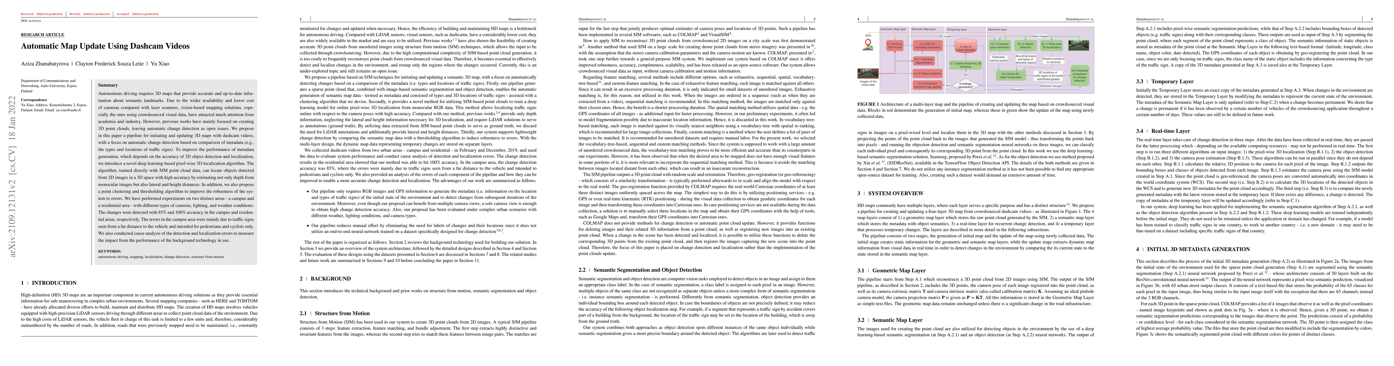 This paper proposes a pipeline for updating 3D maps using dashcam videos, focusing on automatic change detection via metadata comparison. It introduces a deep learning-based algorithm for pixel-wise 3D localization to enhance the accuracy of 3D object detection and localization, achieving 85% and 100% change detection accuracy in campus and residential areas, respectively.
