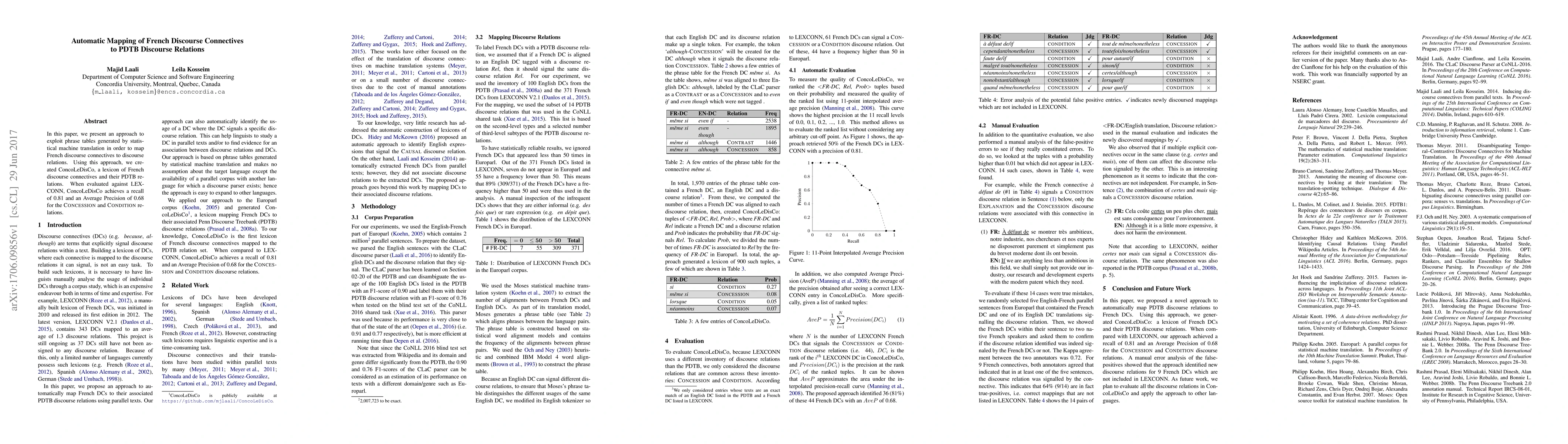 This paper proposes a method to map French discourse connectives to discourse relations using statistical machine translation, resulting in the ConcoLeDisCo lexicon. The new lexicon shows a recall of 0.81 and an Average Precision of 0.68 for Concession and Condition relations when compared to LEXCONN.