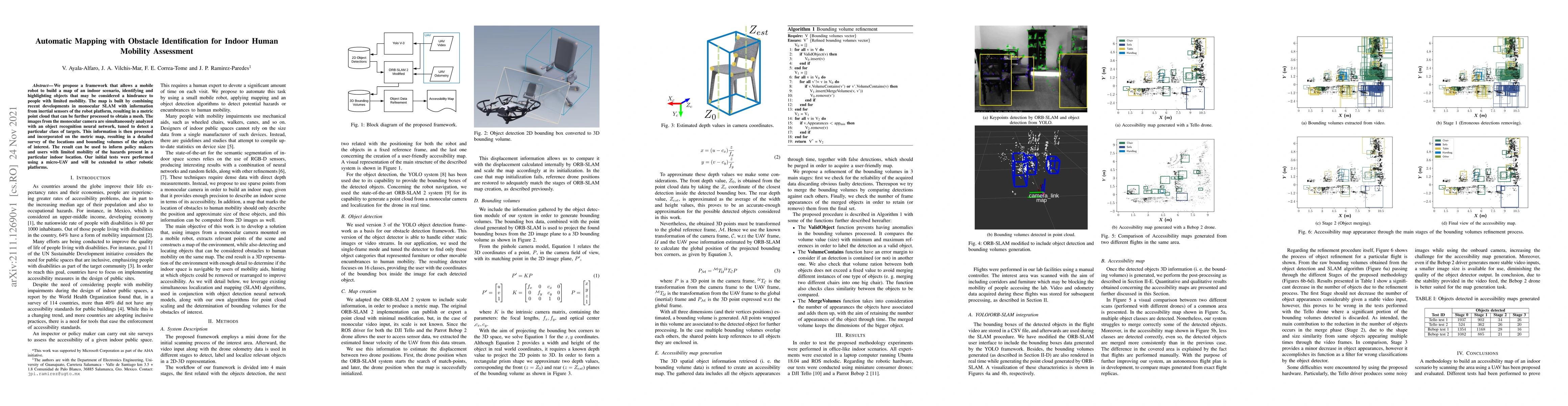 We propose a framework that allows a mobile robot to build a map of an indoor scenario, identifying and highlighting objects that may be considered a hindrance to people with limited mobility. The map is built by combining recent developments in monocular SLAM with information from inertial sensors of the robot platform, resulting in a metric point cloud that can be further processed to obtain a mesh. The images from the monocular camera are simultaneously analyzed with an object recognition neural network, tuned to detect a particular class of targets. This information is then processed and incorporated on the metric map, resulting in a detailed survey of the locations and bounding volumes of the objects of interest. The result can be used to inform policy makers and users with limited mobility of the hazards present in a particular indoor location. Our initial tests were performed using a micro-UAV and will be extended to other robotic platforms.