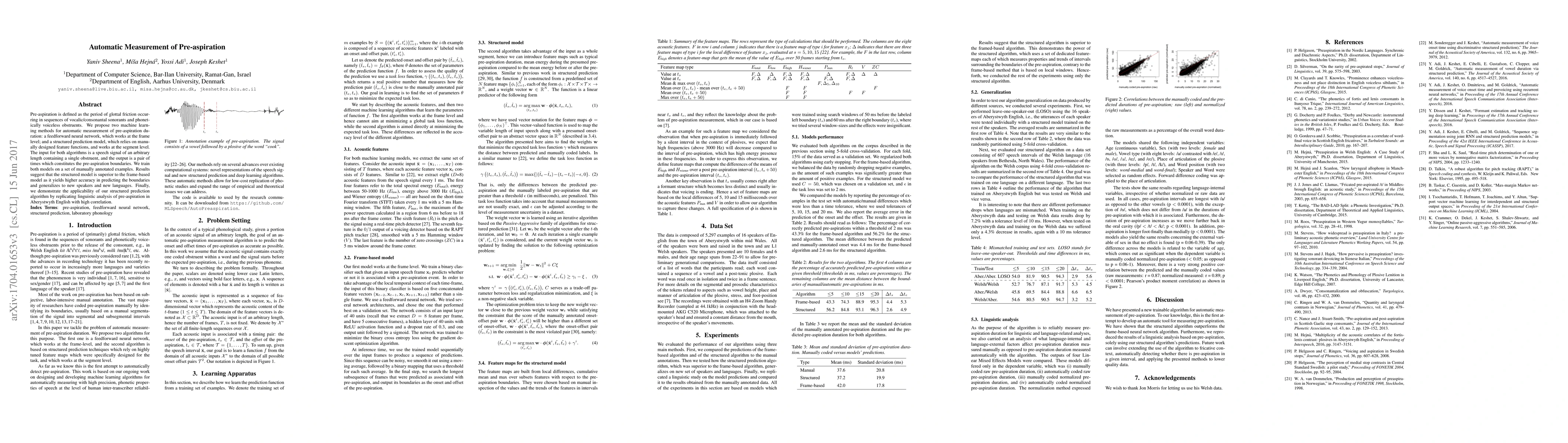 This paper proposes two machine learning methods for automatically measuring pre-aspiration duration, comparing a feedforward neural network with a structured prediction model. The structured model, which uses manually designed features, outperforms the frame-based model in accuracy and generalization.