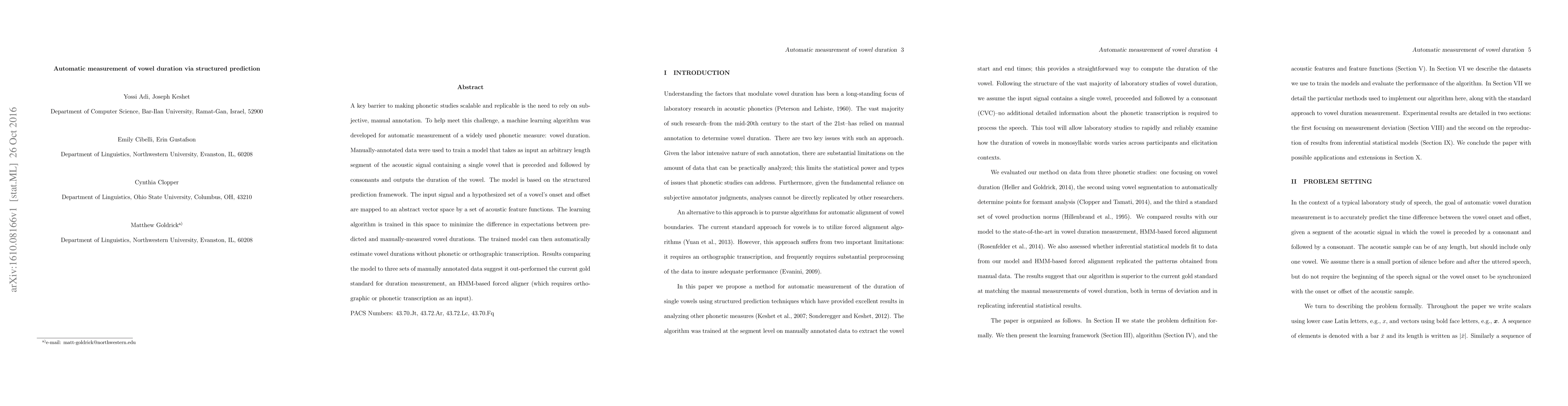 A key barrier to making phonetic studies scalable and replicable is the need to rely on subjective, manual annotation. To help meet this challenge, a machine learning algorithm was developed for automatic measurement of a widely used phonetic measure: vowel duration. Manually-annotated data were used to train a model that takes as input an arbitrary length segment of the acoustic signal containing a single vowel that is preceded and followed by consonants and outputs the duration of the vowel. The model is based on the structured prediction framework. The input signal and a hypothesized set of a vowel's onset and offset are mapped to an abstract vector space by a set of acoustic feature functions. The learning algorithm is trained in this space to minimize the difference in expectations between predicted and manually-measured vowel durations. The trained model can then automatically estimate vowel durations without phonetic or orthographic transcription. Results comparing the model to three sets of manually annotated data suggest it out-performed the current gold standard for duration measurement, an HMM-based forced aligner (which requires orthographic or phonetic transcription as an input).