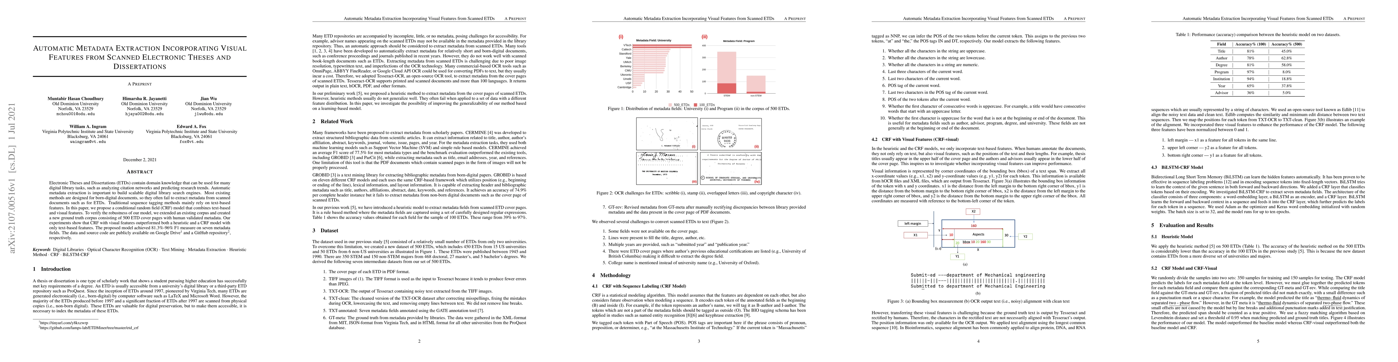 This paper proposes a CRF model that integrates text-based and visual features for automatic metadata extraction from scanned ETDs, outperforming traditional text-only methods and achieving high F1 scores on metadata fields. The model's effectiveness is validated using a new corpus of 500 ETD cover pages with human-validated metadata.