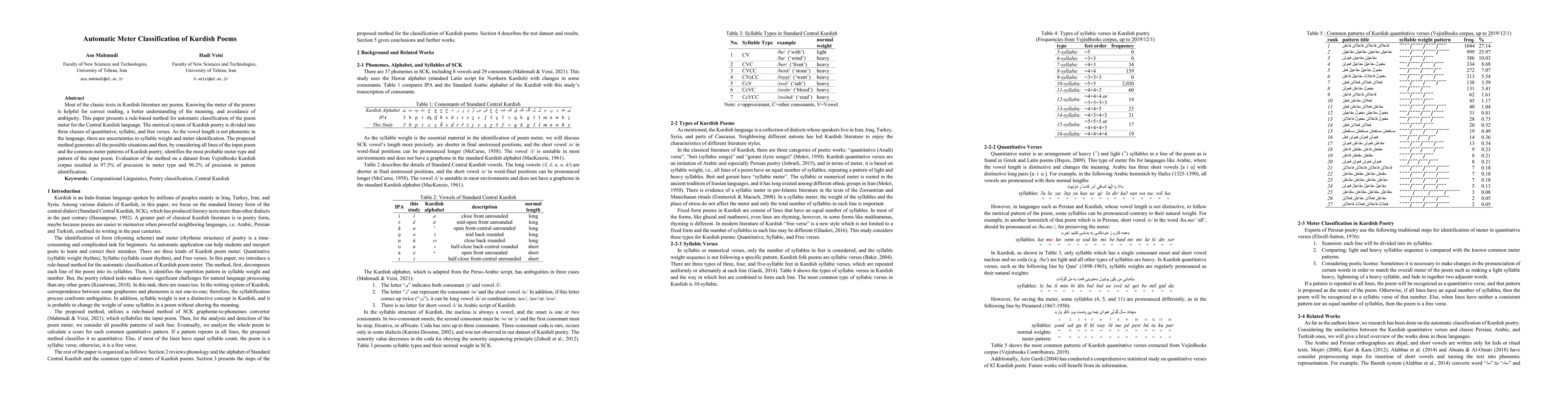 This paper introduces a rule-based method for automatically classifying the meter of Central Kurdish poems, addressing uncertainties in syllable weight due to non-phonemic vowel length. The method achieved 97.3% precision in meter type and 96.2% in pattern identification on a VejinBooks Kurdish corpus dataset.