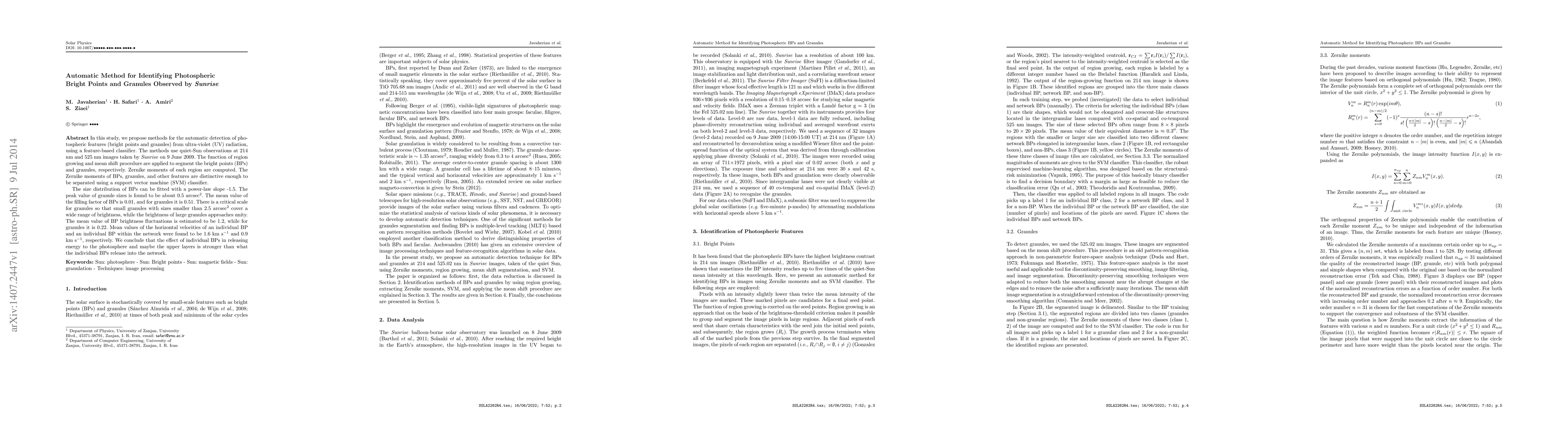 In this study, we propose methods for the automatic detection of photospheric features (bright points and granules) from ultra-violet (UV) radiation, using a feature-based classifier. The methods use quiet-Sun observations at 214 nm and 525 nm images taken by Sunrise on 9 June 2009. The function of region growing and mean shift procedure are applied to segment the bright points (BPs) and granules, respectively. Zernike moments of each region are computed. The Zernike moments of BPs, granules, and other features are distinctive enough to be separated using a support vector machine (SVM) classifier. The size distribution of BPs can be fitted with a power-law slope -1.5. The peak value of granule sizes is found to be about 0.5 arcsec^2. The mean value of the filling factor of BPs is 0.01, and for granules it is 0.51. There is a critical scale for granules so that small granules with sizes smaller than 2.5 arcsec^2 cover a wide range of brightness, while the brightness of large granules approaches unity. The mean value of BP brightness fluctuations is estimated to be 1.2, while for granules it is 0.22. Mean values of the horizontal velocities of an individual BP and an individual BP within the network were found to be 1.6 km/s and 0.9 km/s, respectively. We conclude that the effect of individual BPs in releasing energy to the photosphere and maybe the upper layers is stronger than what the individual BPs release into the network.