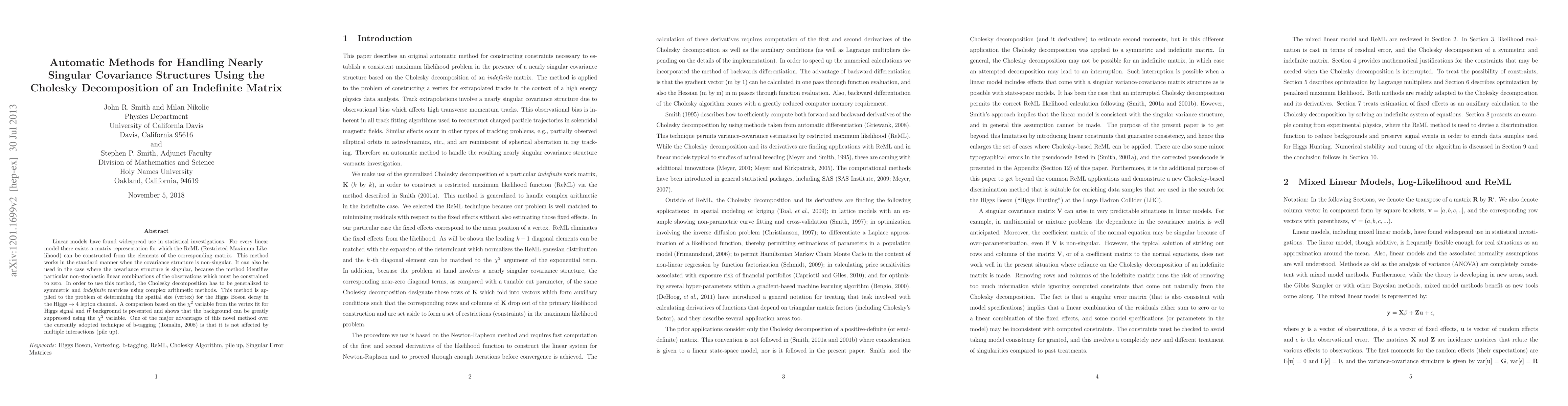 Linear models have found widespread use in statistical investigations. For every linear model there exists a matrix representation for which the ReML (Restricted Maximum Likelihood) can be constructed from the elements of the corresponding matrix. This method works in the standard manner when the covariance structure is non-singular. It can also be used in the case where the covariance structure is singular, because the method identifies particular non-stochastic linear combinations of the observations which must be constrained to zero. In order to use this method, the Cholesky decomposition has to be generalized to symmetric and indefinite matrices using complex arithmetic methods. This method is applied to the problem of determining the spatial size (vertex) for the Higgs Boson decay in the Higgs -> 4 lepton channel. A comparison based on the Chi-Square variable from the vertex fit for Higgs signal and t-tbar background is presented and shows that the background can be greatly suppressed using the Chi-Square variable. One of the major advantages of this novel method over the currently adopted technique of b-tagging is that it is not affected by multiple interactions (pile up).