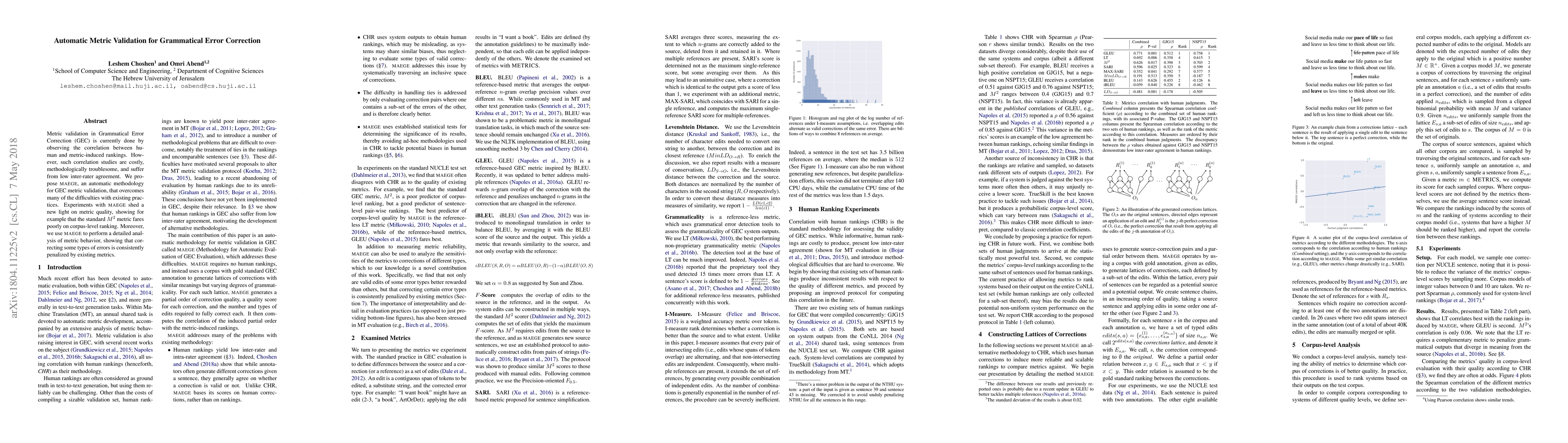 The paper introduces MAEGE, an automatic method for validating Grammatical Error Correction (GEC) metrics, addressing the costly and unreliable correlation studies between human and metric-induced rankings. Experiments reveal that the standard $M^2$ metric performs poorly on corpus-level ranking and highlight consistent penalties for correcting certain error types.