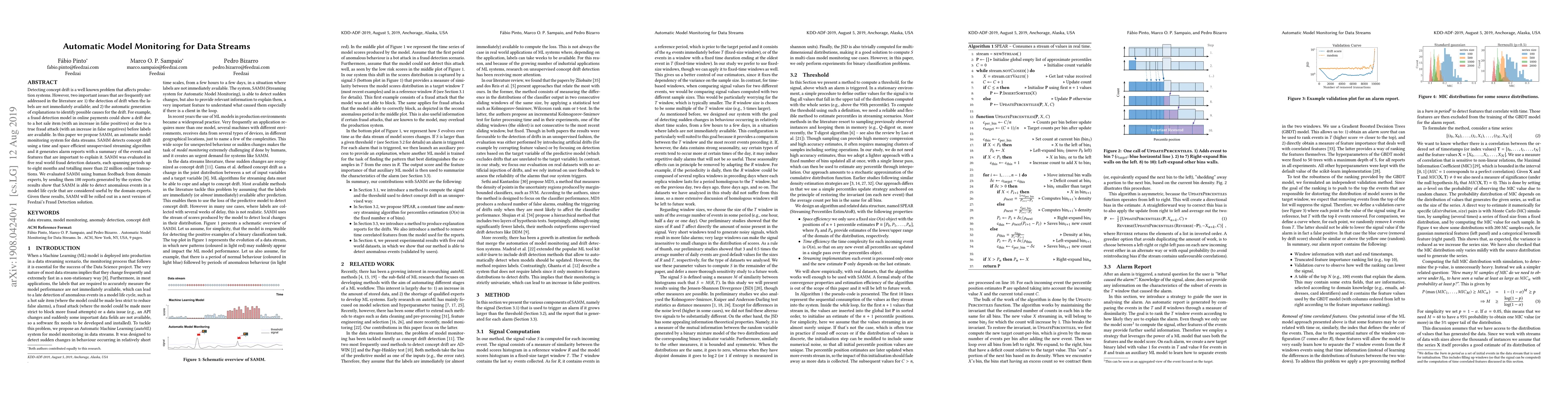 Detecting concept drift is a well known problem that affects production systems. However, two important issues that are frequently not addressed in the literature are 1) the detection of drift when the labels are not immediately available; and 2) the automatic generation of explanations to identify possible causes for the drift. For example, a fraud detection model in online payments could show a drift due to a hot sale item (with an increase in false positives) or due to a true fraud attack (with an increase in false negatives) before labels are available. In this paper we propose SAMM, an automatic model monitoring system for data streams. SAMM detects concept drift using a time and space efficient unsupervised streaming algorithm and it generates alarm reports with a summary of the events and features that are important to explain it. SAMM was evaluated in five real world fraud detection datasets, each spanning periods up to eight months and totaling more than 22 million online transactions. We evaluated SAMM using human feedback from domain experts, by sending them 100 reports generated by the system. Our results show that SAMM is able to detect anomalous events in a model life cycle that are considered useful by the domain experts. Given these results, SAMM will be rolled out in a next version of Feedzai's Fraud Detection solution.
