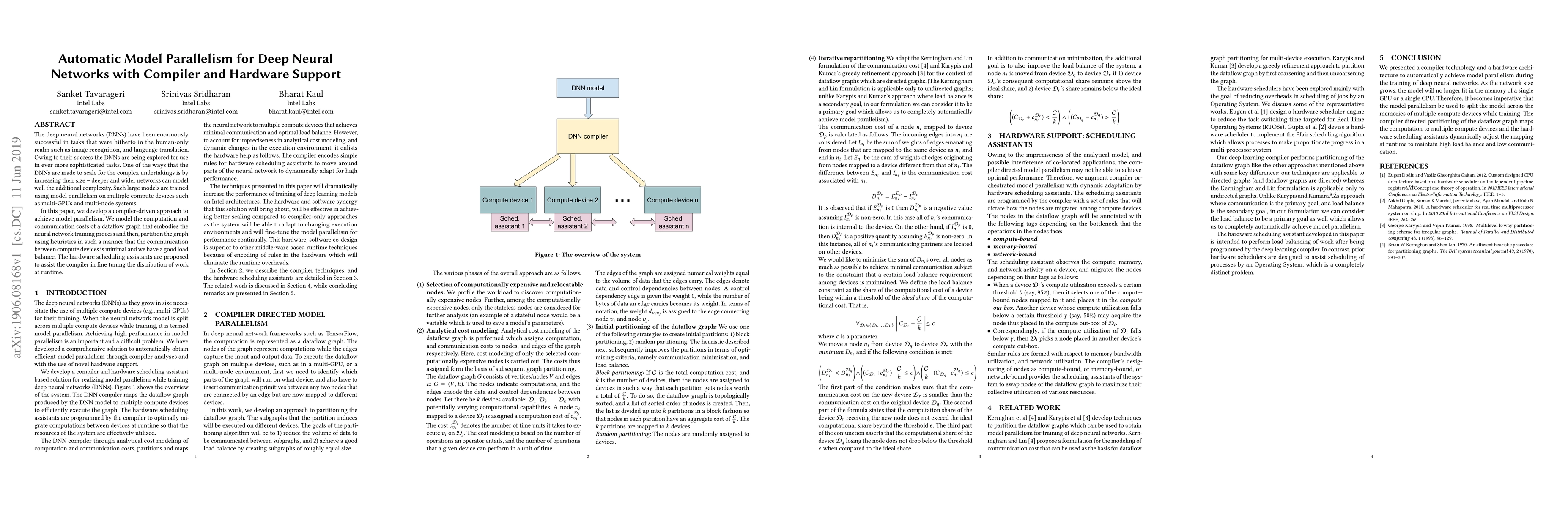 This paper proposes a compiler-driven method for automatic model parallelism in deep neural networks, optimizing computation and communication costs through dataflow graph partitioning. It also introduces hardware scheduling assistants to enhance runtime distribution of work, aiming to scale large DNNs efficiently on multi-GPU and multi-node systems.