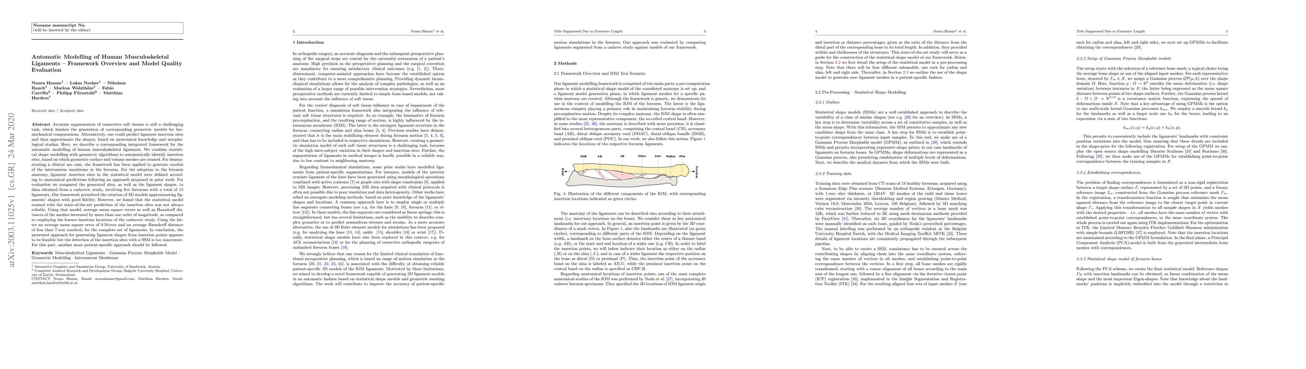Accurate segmentation of connective soft tissues is still a challenging task, which hinders the generation of corresponding geometric models for biomechanical computations. Alternatively, one could predict ligament insertion sites and then approximate the shapes, based on anatomical knowledge and morphological studies. Here, we describe a corresponding integrated framework for the automatic modelling of human musculoskeletal ligaments. We combine statistical shape modelling with geometric algorithms to automatically identify insertion sites, based on which geometric surface and volume meshes are created. For demonstrating a clinical use case, the framework has been applied to generate models of the interosseous membrane in the forearm. For the adoption to the forearm anatomy, ligament insertion sites in the statistical model were defined according to anatomical predictions following an approach proposed in prior work. For evaluation we compared the generated sites, as well as the ligament shapes, to data obtained from a cadaveric study, involving five forearms with a total of 15 ligaments. Our framework permitted the creation of 3D models approximating ligaments' shapes with good fidelity. However, we found that the statistical model trained with the state-of-the-art prediction of the insertion sites was not always reliable. Using that model, average mean square errors as well as Hausdorff distances of the meshes increased by more than one order of magnitude, as compared to employing the known insertion locations of the cadaveric study. Using the latter an average mean square error of 0.59 mm and an average Hausdorff distance of less than 7 mm resulted, for the complete set of ligaments. In conclusion, the presented approach for generating ligament shapes from insertion points appears to be feasible but the detection of the insertion sites with a SSM is too inaccurate.