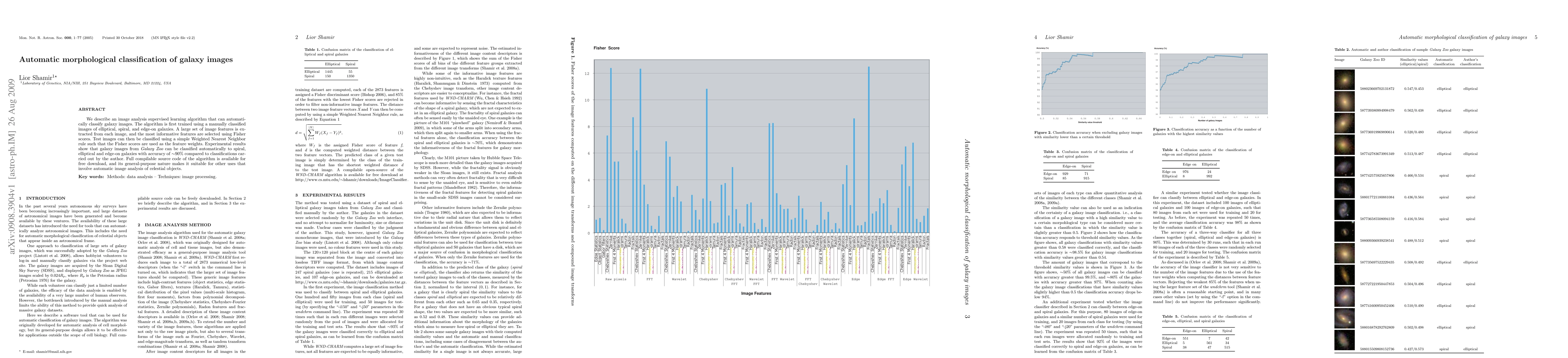 This paper presents a supervised learning algorithm for automatic morphological classification of galaxy images, trained on manually classified samples and validated with Galaxy Zoo data, achieving ~90% accuracy. The algorithm extracts image features and uses Fisher scores for feature selection and classification.
