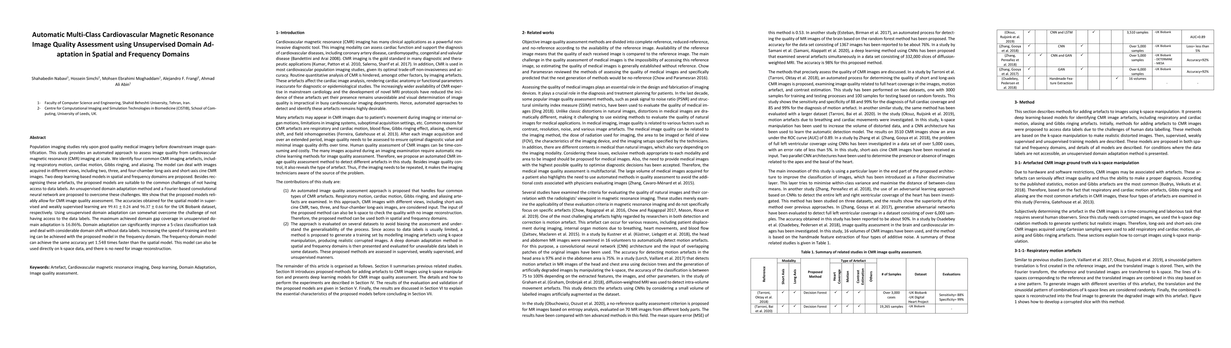 This paper presents an automated deep learning approach for assessing the quality of cardiovascular magnetic resonance (CMR) images, identifying common artefacts like respiratory and cardiac motion. It proposes two models in spatial and frequency domains, employing unsupervised domain adaptation to tackle the challenge of unlabeled data, achieving high accuracy and faster processing speeds.