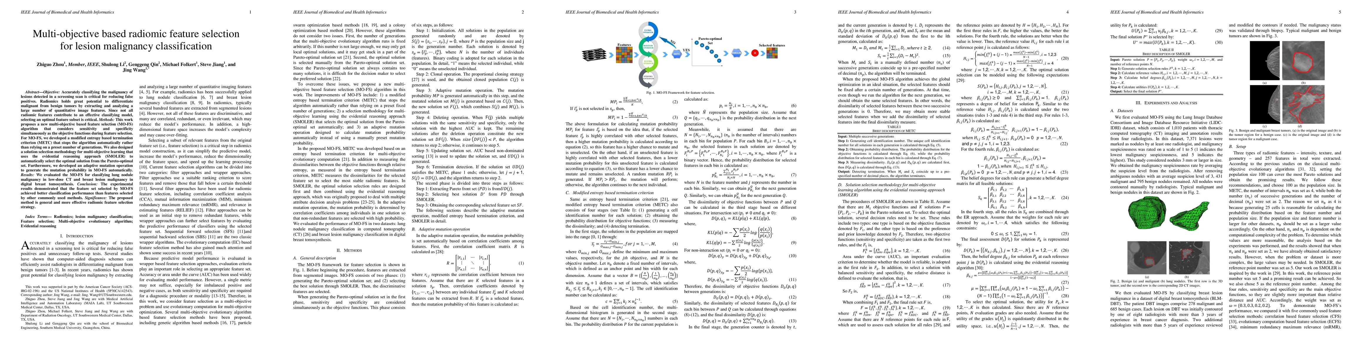 This paper proposes a multi-objective based feature selection algorithm for improving the classification of malignant and benign tumors using radiomic features, showing better performance in lung nodule and breast lesion malignancy detection compared to other methods. The approach includes a modified entropy termination criterion and an adaptive mutation operation to enhance feature selection efficiency.