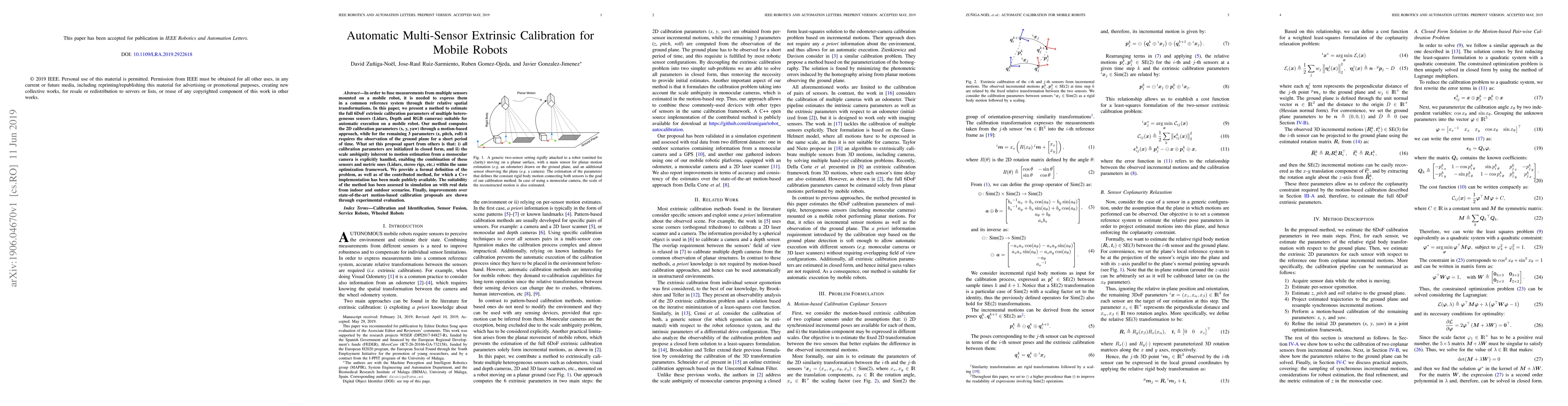 This paper presents an automatic method for calibrating multiple heterogeneous sensors on mobile robots, estimating full 6DoF extrinsic parameters through a closed-form initialization and handling scale ambiguity. The method combines motion-based and ground plane observation techniques, and it effectively removes outliers to improve accuracy.