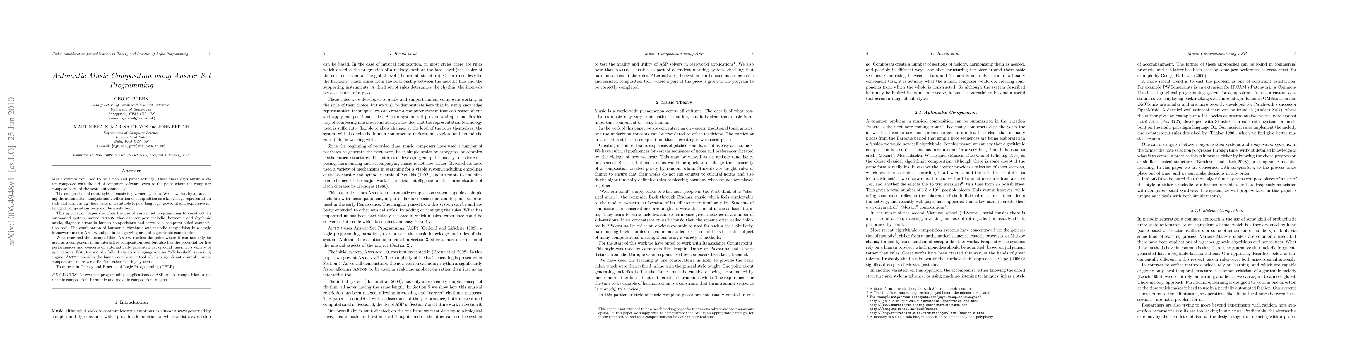 This paper introduces ANTON, an automated music composition system using answer set programming to generate melodic, harmonic, and rhythmic music, and diagnose errors in human compositions. ANTON's unique integration of these elements in a single framework offers a simpler, more versatile tool for composers compared to existing systems.