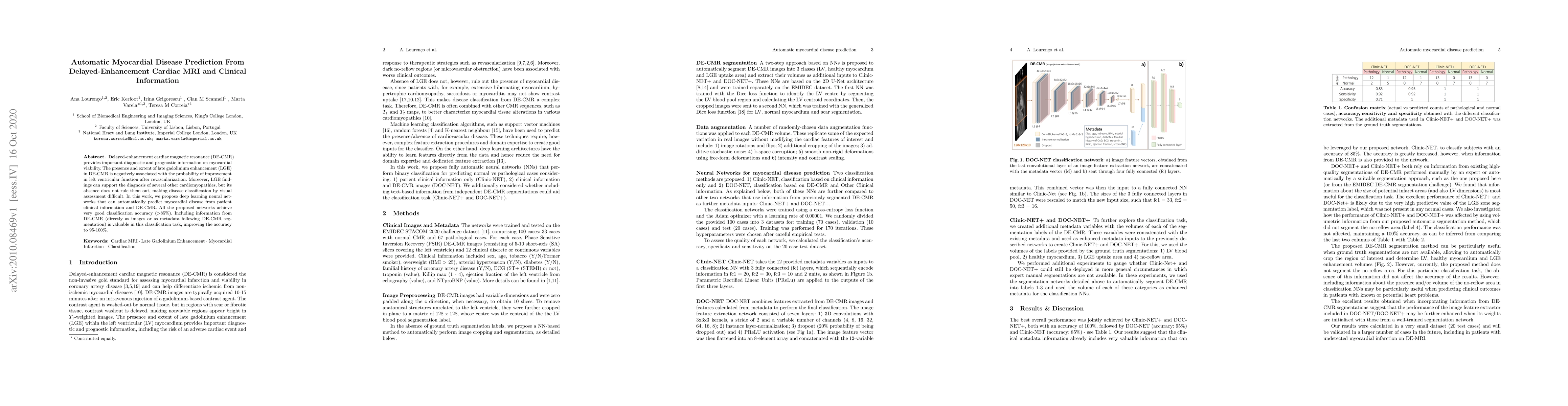 This research proposes deep learning neural networks to automatically predict myocardial disease from delayed-enhancement cardiac MRI (DE-CMR) and clinical information, achieving high classification accuracy (>85%). The inclusion of DE-CMR data, especially post-segmentation metadata, significantly enhances accuracy to 95-100%.