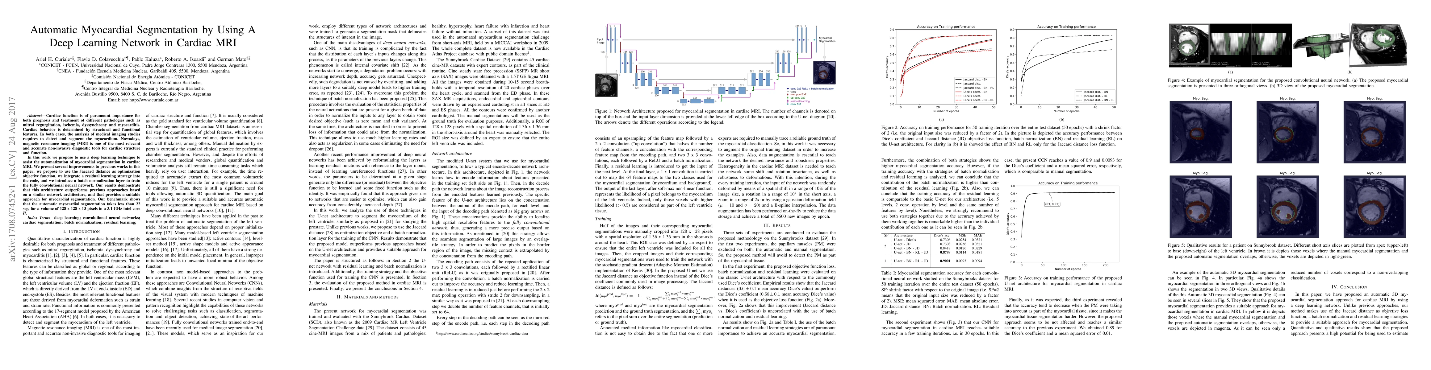 This paper proposes a deep learning network for automatic myocardial segmentation in cardiac MRI, utilizing a Jaccard distance optimization, residual learning, and batch normalization. The method outperforms previous techniques and achieves segmentation in under 22 seconds for a 128x128x13 volume on a 3.1 GHz Intel Core i7.