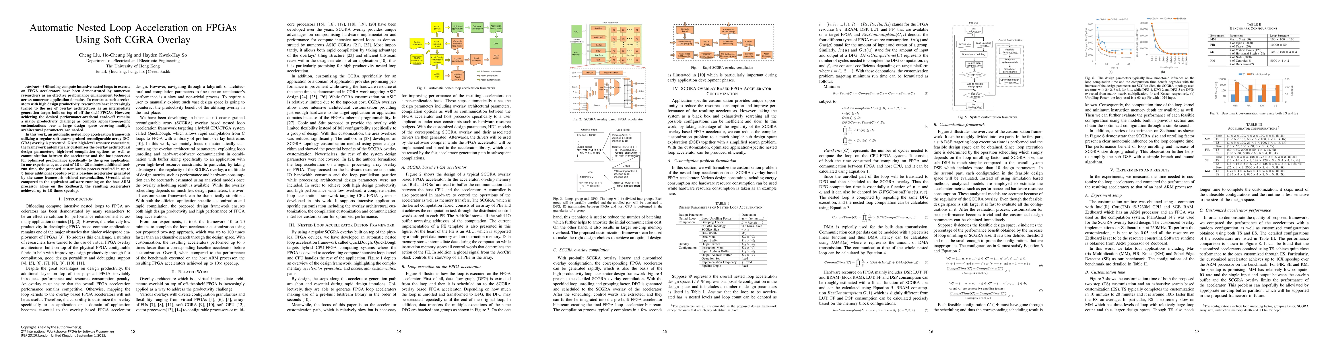 This paper presents an automatic framework for accelerating nested loops on FPGAs using a soft coarse-grained reconfigurable array (SCGRA) overlay, which optimizes design parameters, compilation options, and communication for enhanced performance. The framework achieved up to 5 times speedup over baseline configurations and up to 10 times speedup compared to software running on an ARM processor.