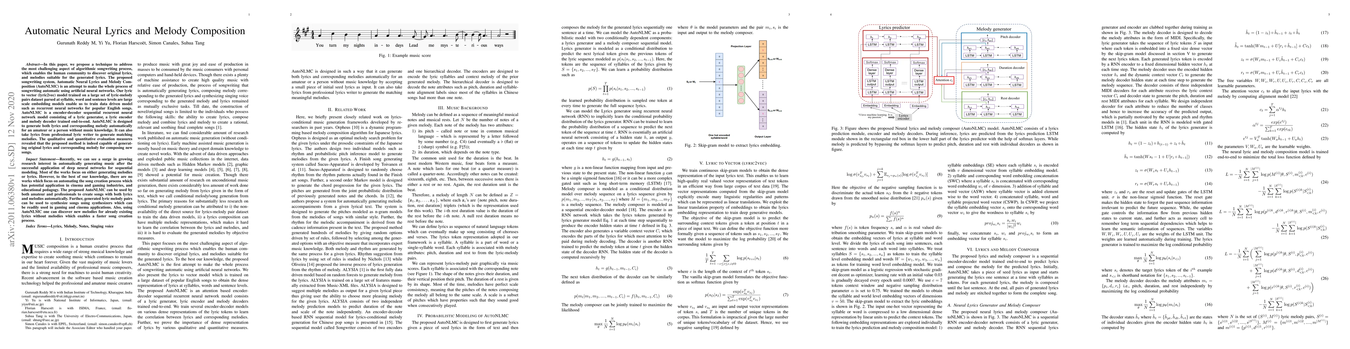 This paper introduces AutoNLMC, an automatic neural system for composing original lyrics and melodies using recurrent neural networks. The system employs a lyric2vec model and an encoder-decoder architecture to generate both lyrics and matching melodies, demonstrating its effectiveness through qualitative and quantitative evaluations.