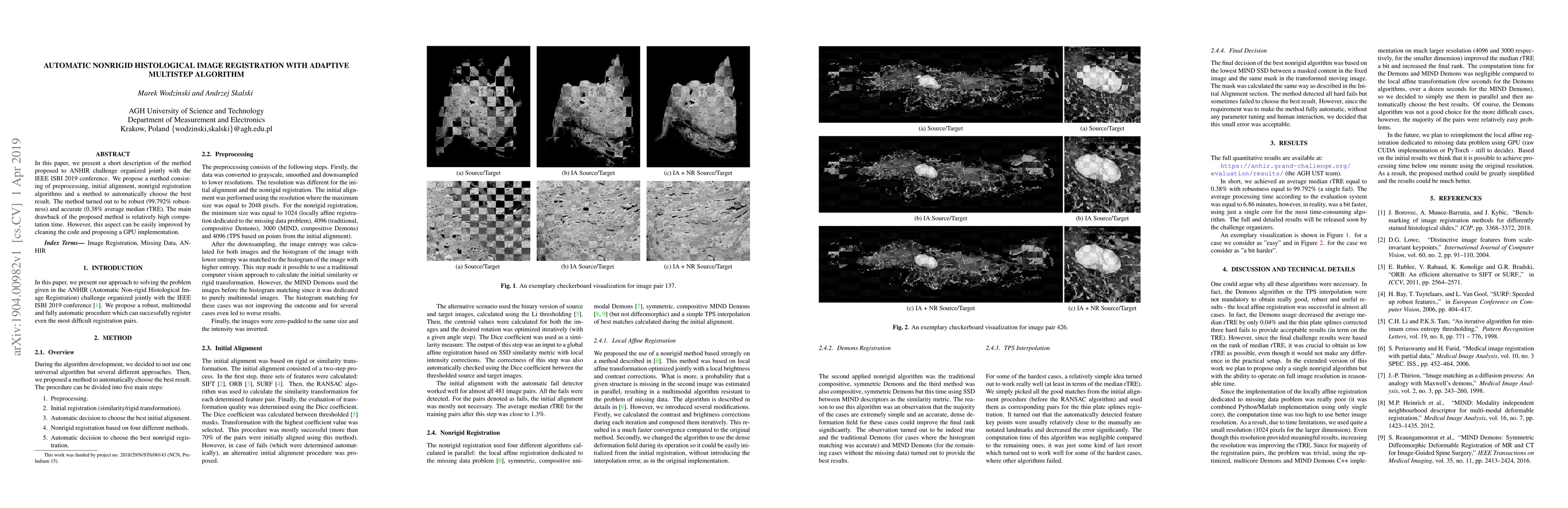 This paper introduces an adaptive multistep algorithm for automatic nonrigid histological image registration, achieving 99.792% robustness and 0.38% average median rTRE accuracy. The main limitation is high computation time, which could be mitigated through code optimization and GPU implementation.