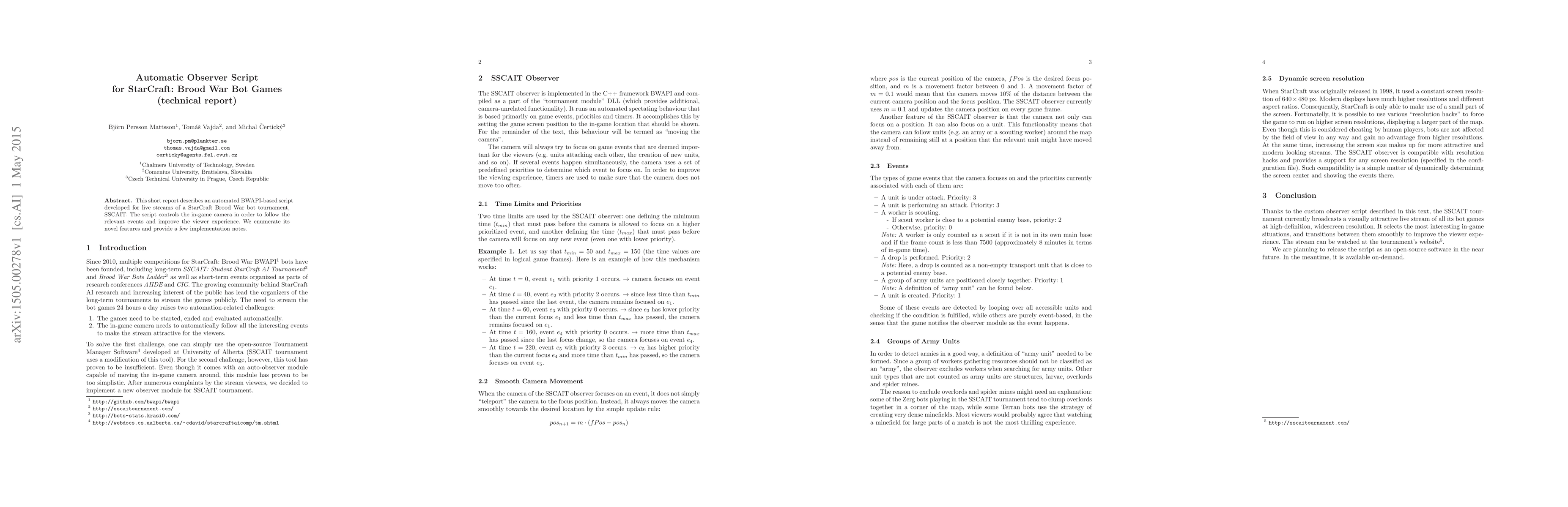 This short report describes an automated BWAPI-based script developed for live streams of a StarCraft Brood War bot tournament, SSCAIT. The script controls the in-game camera in order to follow the relevant events and improve the viewer experience. We enumerate its novel features and provide a few implementation notes.
