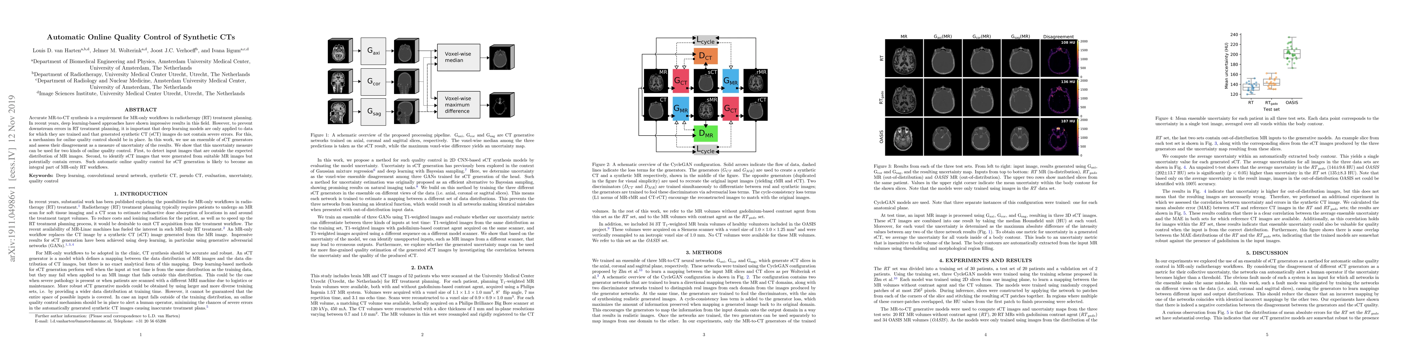This research introduces an automatic online quality control mechanism for synthetic CT (sCT) generation using deep learning in MR-only radiotherapy treatment planning. The method leverages an ensemble of sCT generators to assess disagreement as a measure of uncertainty, enabling detection of input images outside the expected MR distribution and identification of potentially erroneous sCT images.