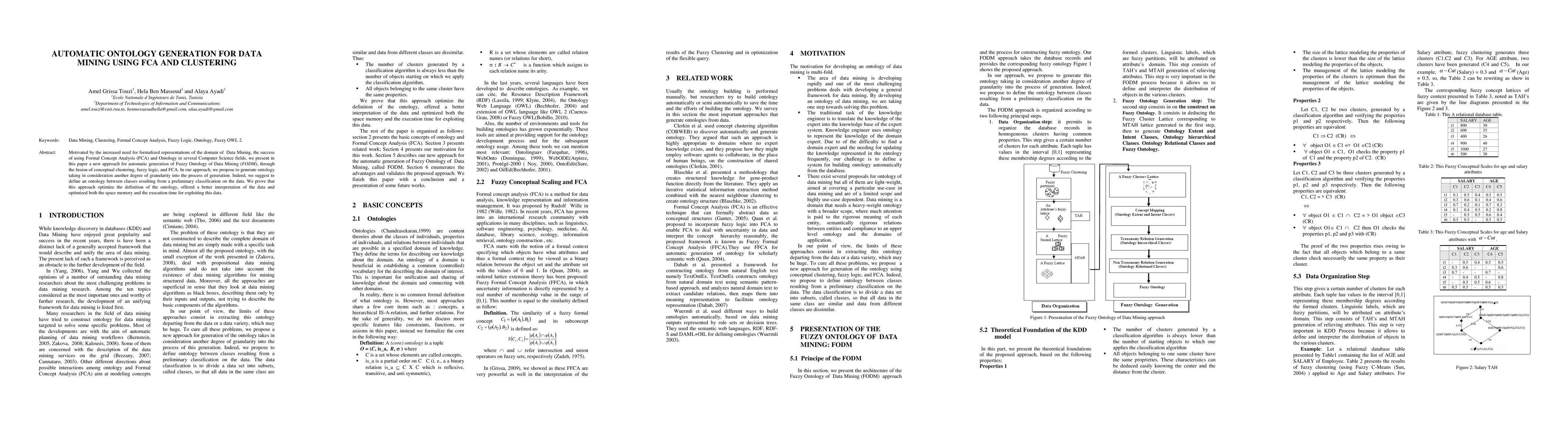 The research presents a new approach for automatic generation of Fuzzy Ontology of Data Mining (FODM) by fusing conceptual clustering, fuzzy logic, and Formal Concept Analysis (FCA). It involves a two-step process: (1) Data Organization to organize database records into homogeneous clusters with common properties, and (2) Fuzzy Ontology Generation to construct a Fuzzy Ontology from these clusters.