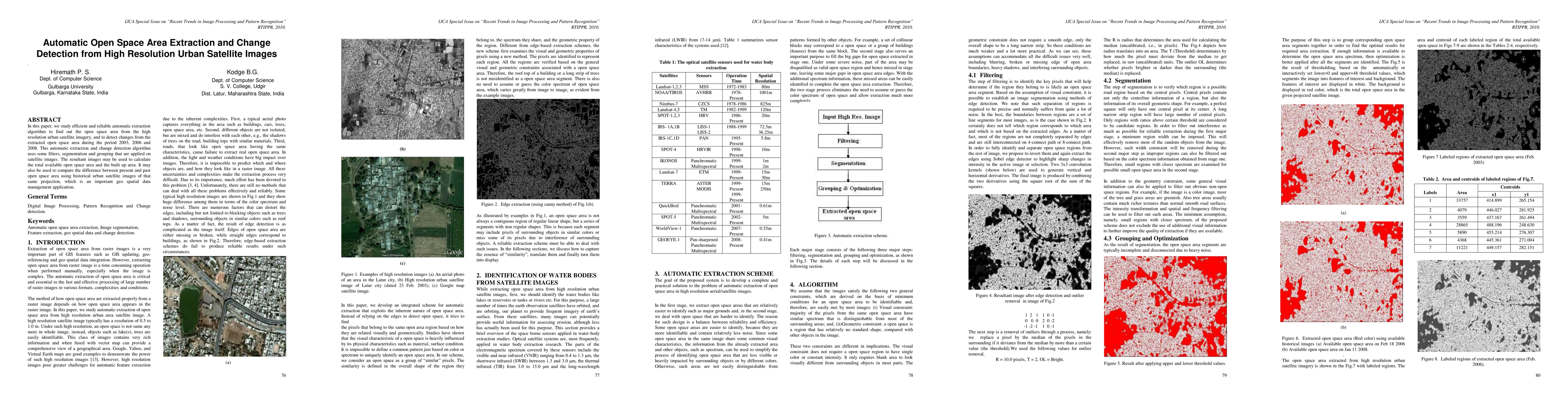 This paper presents an automatic algorithm for extracting open space areas from high-resolution urban satellite images and detecting changes over time from 2003 to 2008. The method employs filters, segmentation, and grouping techniques to quantify available open space and built-up areas, aiding in historical urban planning and geospatial data management.