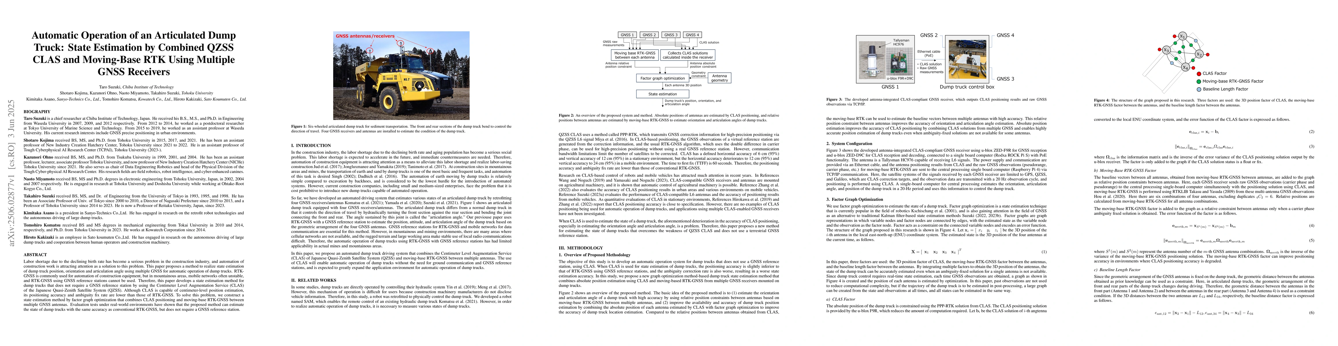 The research proposes a state estimation method for dump trucks using multiple GNSS receivers, combining QZSS CLAS and moving-base RTK-GNSS via factor graph optimization, eliminating the need for a GNSS reference station.
