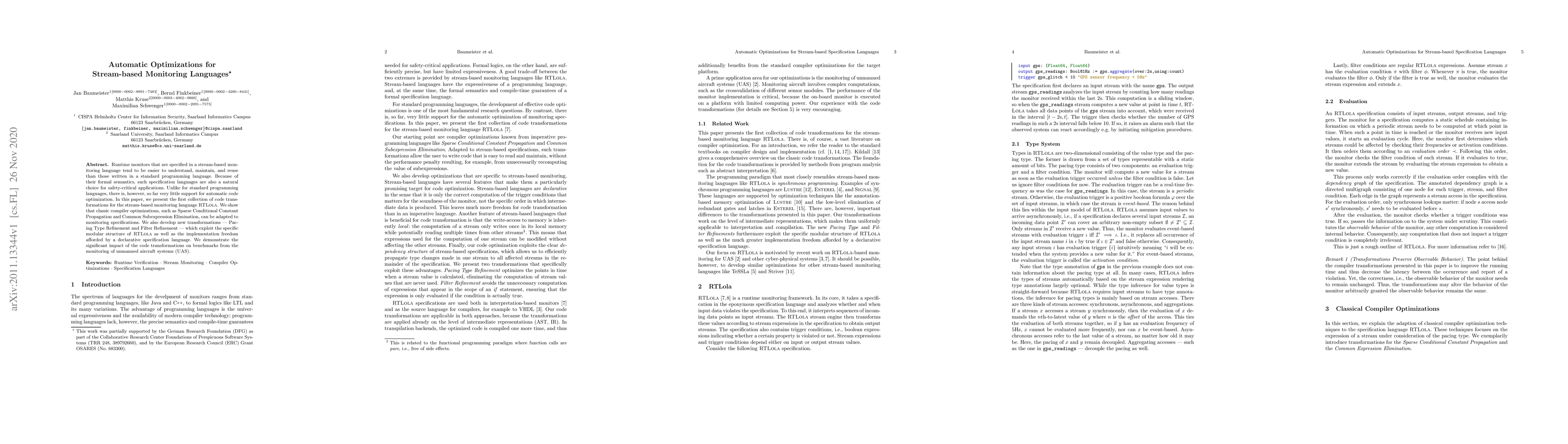 This paper introduces automatic optimization techniques for RTLola, a stream-based monitoring language, including adaptations of classic compiler optimizations and new transformations tailored to RTLola's modular structure. The optimizations significantly improve performance in benchmarks related to unmanned aircraft systems monitoring.