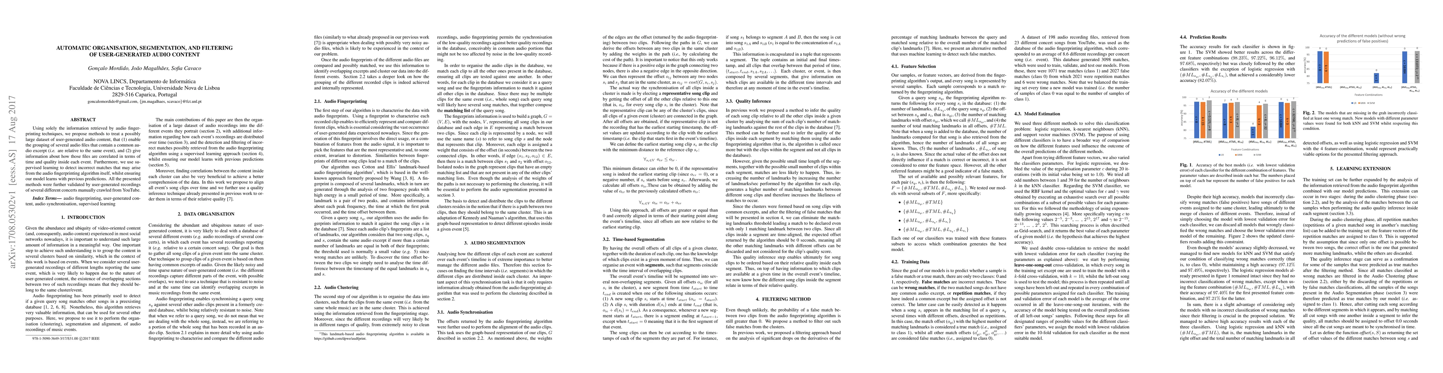 Researchers developed methods to organize user-generated audio content using audio fingerprinting techniques, enabling grouping of related files and correlation analysis within events. The study also applied supervised learning to detect incorrect matches and validate the model with real-world concert recordings.